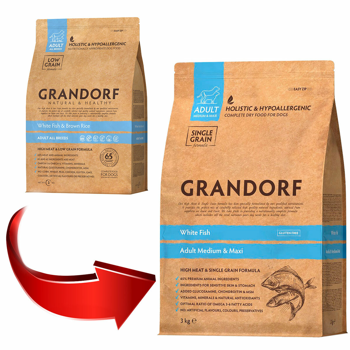 Сухой корм Grandorf Adult White Fish для собак с белой рыбой специально разработан для тех питомцев, которые требуют особого внимания и ухода за кожей и шерстью, а также питомцам с чувствительным пищеварением или склонных к аллергии. Формула богата мясом океанических рыб, насыщена Омега-6, Омега-3 и необходимыми аминокислотами. Тщательно отобранные, натуральные гипоаллергенные ингредиенты, помогают предотвратить аллергические реакции и пищевую непереносимость, обеспечивая иммунное и пищеварительное здоровье. Деликатный способ приготовления сохраняет все полезные свойства и питательные вещества натуральных ингредиентов обеспечивают отличное физическое состояние питомца.