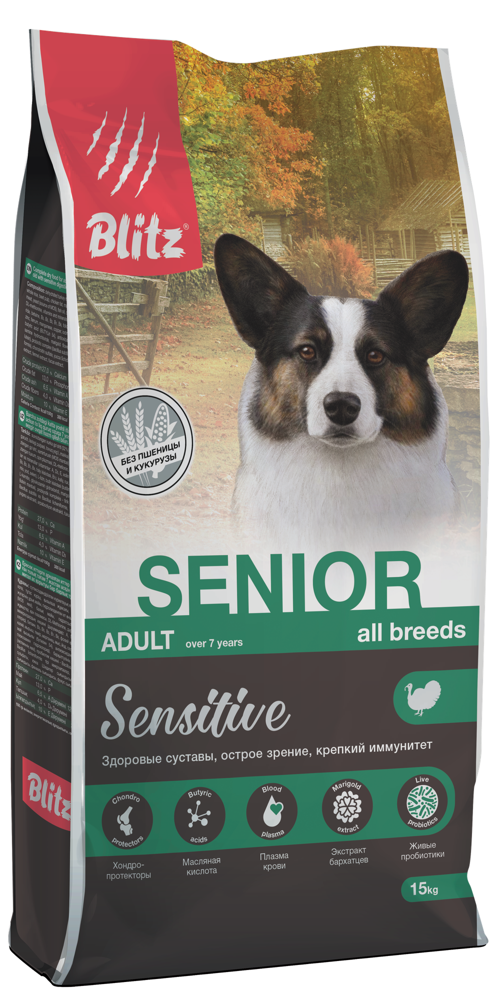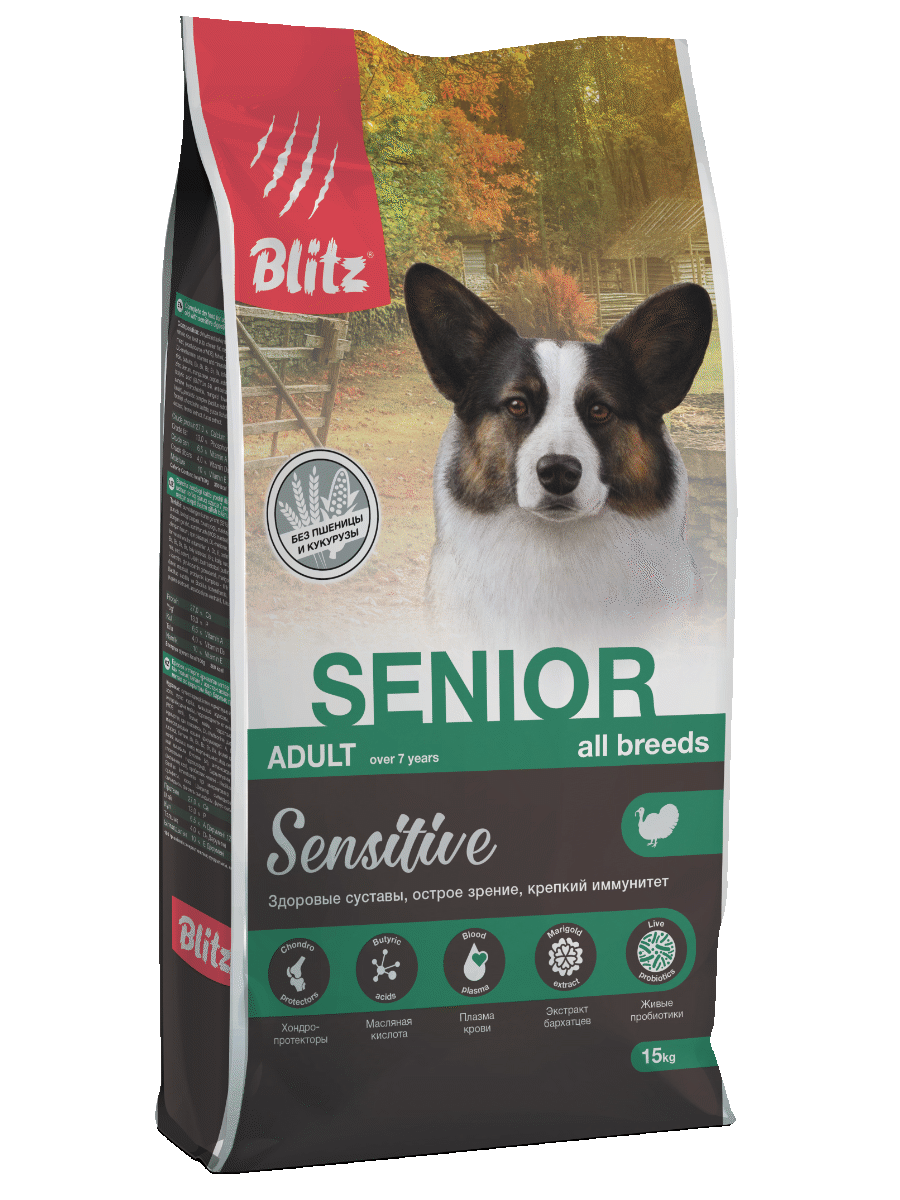 Что отличает корм Blitz Sensitive для пожилых собак?