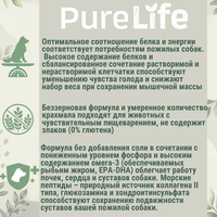Корм Pure Life Adult 7+ содержит дегидратированные белки животного происхождения (25%), волокна бобов, картофельный крахмал, гороховый крахмал, батат, утиный и свиной жир, белковые гидролизаты дикой белой рыбы, а также семена льна, гороховый крахмал, рапсовое масло, карбонат кальция, пивные дрожжи, рыбные аутолизаты, артишок, рыбий жир, сушеную морковь, фруктоолигосахариды, фенхель, морские водоросли, тыкву, морские пептиды, клюкву, черную смородину, гранат, экстракт дрожжей, ацеролу, облепиху, чернику, дыню. Оптимальное соотношение белка и энергии соответствует потребностям пожилых собак.