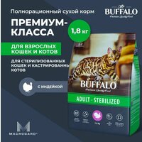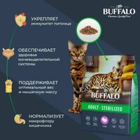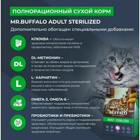 Сухой корм Mr.Buffalo Эдалт Стерилайз для кошек с индейкой сочетает в себе все достоинства полноценного и полезного рациона. Сбалансированный состав, оптимальное сочетание белков, жиров и углеводов, содержание необходимых витаминов и минералов — вот что выгодно отличает сухой корм для кошек от любого другого. Корм сухой для кошек Mr. Buffalo Эдалт Стерилайз разработан с учётом потребностей стерилизованных кошек и кастрированных котов, включает все необходимые питательные вещества для поддержания жизненных сил, здоровья мочевыделительной системы, поддержания оптимального веса и мышечной массы питомца. Корм содержит ненасыщенные жирные кислоты Омега-3 и Омега-6, обеспечивающие иммунитет, здоровую кожу и отличную шерсть. Продукт содержит: Дегидрированное мясо индейки (33%), цельнозерновой рис, протеин растительного происхождения, маис, пульпа сахарной свеклы, жир куриный, гидролизованная и дегидратированная куриная печень, дрожжи (источник MOS), витаминно-минеральный премикс (витамины: А, В4, Е, D3, В3, С, В1, В5, В2, В6, В9, К3, В7, В12; минералы: калий, железо, цинк, марганец, медь, йод, селен), дегидрированное яйцо, масло кукурузное, аминокислота DL-метионин, клюква, L-карнитин, антиоксидант, таурин, пребиотик MacroGard® (источник β-глюканов), экстракт розмарина (природный антиоксидант и натуральный консервант), экстракт фенхеля (источник витаминов, микро- и макроэлементов), экстракт морских водорослей (фукус), экстракт Юкки Шидигера. Энергетическая ценность: 376 ккал/100гВ сухих кормах Mr. Buffalo Эдалт Стерилайз одним из ключевых компонентов является уникальное запатентованное вещество MacroGard (МакроГард), которое является натуральным иммуностимулятором. Он активизирует естественные функции организма кошек и собак, помогает им бороться с инфекциями, поддерживает здоровое пищеварение, повышает сопротивляемость организма к бактериям, вирусам, грибкам и понижает риск различных заболеваний. Важно, что кошачий корм сухой хорошо и долго хранится, легко делится на порции, а питомцы обожают его и с удовольствием грызут хрустящие гранулы. Но главное, отныне вы можете быть спокойны за здоровье вашего питомца — производитель тщательно продумал состав и создал высококачественный корм для кошек. Отличная физическая форма, крепкие зубы и кости, блестящая шерстка и игривое настроение — вот что обеспечивает корм для кошек сухой Mr. Buffalo Эдалт Стерилайз с индейкой. СоставКорм для кошек сухой содержит: Дегидрированное мясо индейки (33%), цельнозерновой рис, протеин растительного происхождения, маис, пульпа сахарной свеклы, жир куриный, гидролизованная и дегидратированная куриная печень, дрожжи (источник MOS), витаминно-минеральный премикс (витамины: А, В4, Е, D3, В3, С, В1, В5, В2, В6, В9, К3, В7, В12; минералы: калий, железо, цинк, марганец, медь, йод, селен), дегидрированное яйцо, масло кукурузное, аминокислота DL-метионин, клюква, L-карнитин, антиоксидант, таурин, пребиотик MacroGard (источник β-глюканов), экстракт розмарина (природный антиоксидант и натуральный консервант), экстракт фенхеля (источник витаминов, микро- и макроэлементов), экстракт морских водорослей (фукус), экстракт Юкки Шидигера.