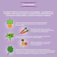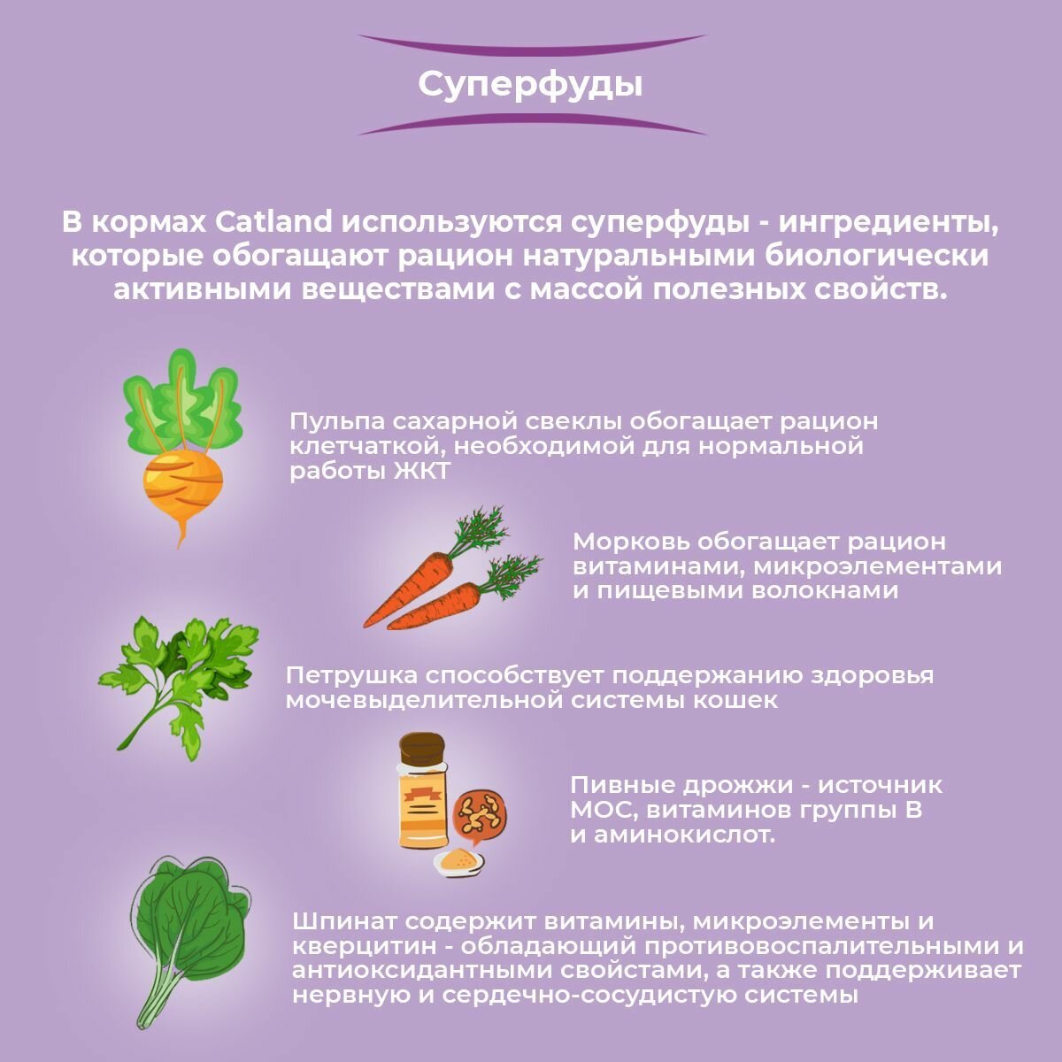 Сухой полнорационный корм «Catland» разработан для ежедневного кормления взрослых стерилизованных кошек всех пород. Корм полностью сбалансирован по всем питательным веществам, включая витамины и минералы, с учетом потребностей взрослых кошек. Гранулы корма специально адаптированы для челюстей кошек, а «Сухая» текстура корма способствует удалению зубного налета. Корма Catland изготавливаются в экологически чистом Алтайском крае на базе крупнейшего агропромышленного комплекса Алейскзернопродукт, из сырья местных производителей, на оборудовании ведущих мировых фирм — Wenger, Cusinato, Ricciarelli, Effytec. Сырье и готовые корма проходят тщательную проверку в собственной аккредитованной лаборатории. Корма Catland — премиальное качество не уступающее импортным аналогам.