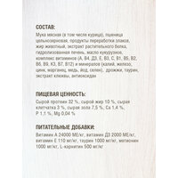 сырой протеин 32%, сырой жир 10%, сырая клетчатка 3%, сырая зола 7,5%, массовая доля влаги 10%, Са 1,4%, Р 1,1%, Mg 0,04 %