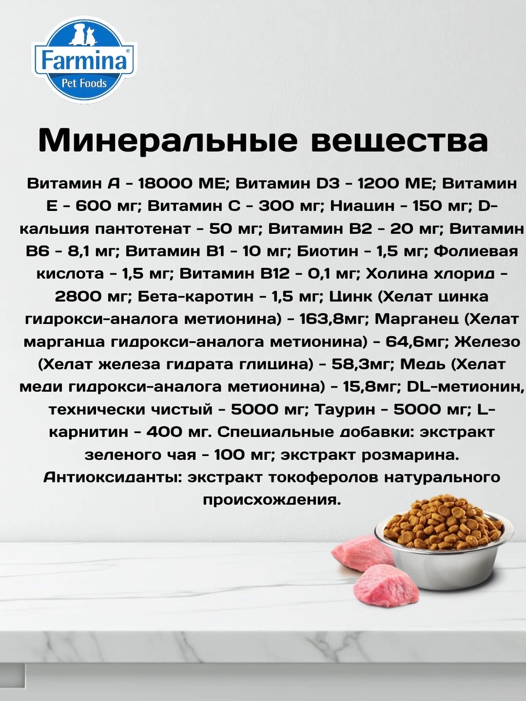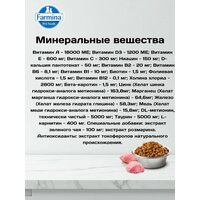 | Минеральные вещества | на 1 кг: цинк 163.8мг, марганец 64.6мг, железо 58.3мг, медь 15.8мг, селенометионин 0,40мг, DL-метионин 5000мг, таурин 5000мг, L-карнитин 400мг |