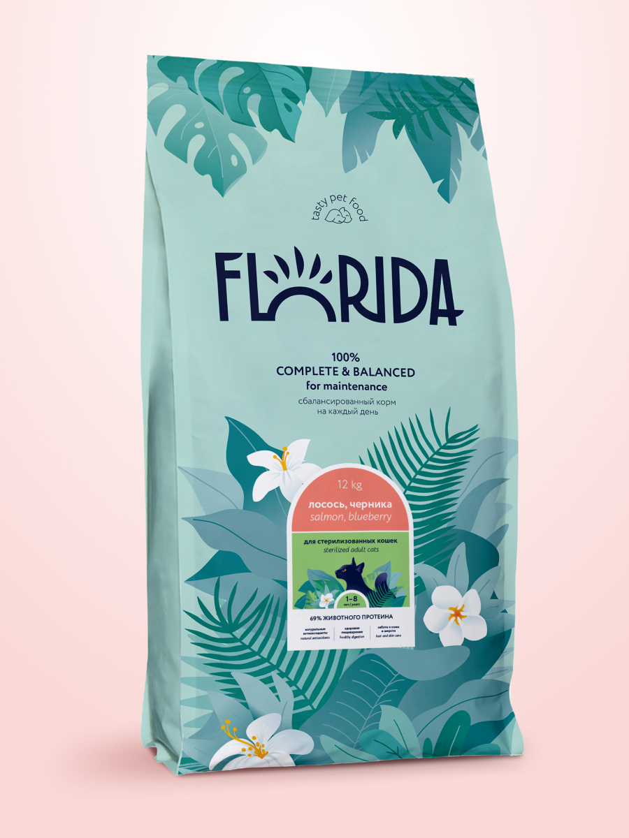 Florida Salmon & Blueberry - сухой корм супер-премиум-класса с лососем и черникой для стерилизованных кошек в возрасте от 1 до 8 лет. Сбалансированное полнорационное питание заботится о коже и шерсти и способствует здоровому пищеварению. В рационе кормов Florida используется только белок животного происхождения.