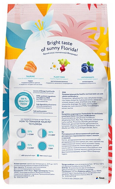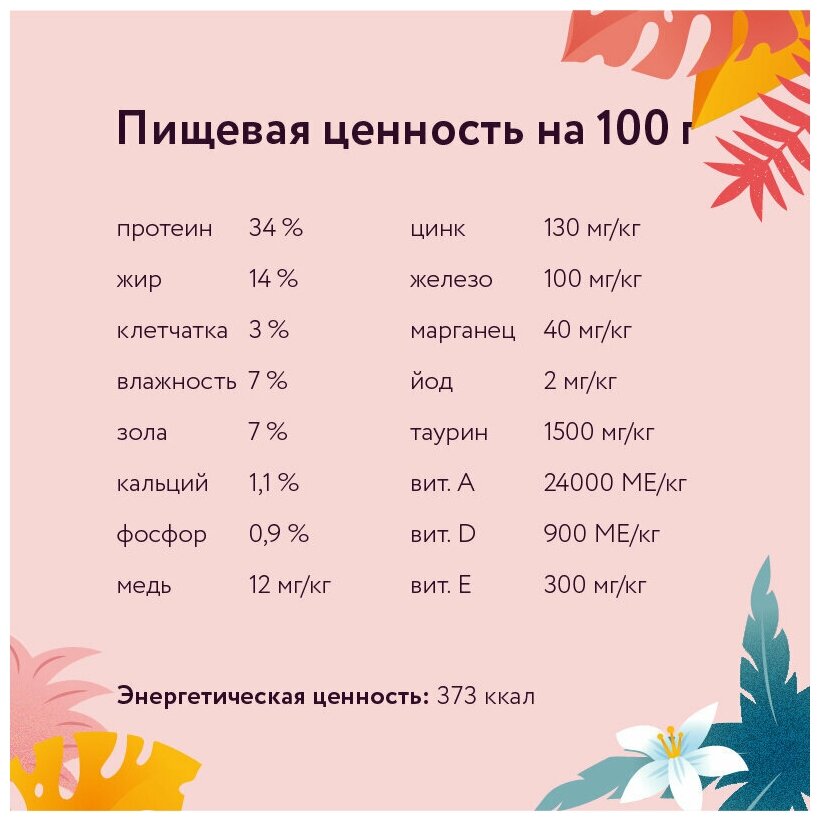 Florida Salmon & Blueberry - сухой корм супер-премиум-класса с лососем и черникой для стерилизованных кошек в возрасте от 1 до 8 лет. Сбалансированное полнорационное питание заботится о коже и шерсти и способствует здоровому пищеварению. В рационе кормов Florida используется только белок животного происхождения. Преимущества корма: натуральные антиоксиданты ⸙ ягоды, фрукты поддержка опорно-двигательной системы ⸙ глюкозамин, хондроитин поддержка работы сердечно-сосудистой системы, зрения ⸙ таурин здоровое пищеварение ⸙ свекла, морковь, дрожжи натуральные источники Омега 3 и 6 кислот, забота о шерсти и коже ⸙ семена льна, куриный жир, рыбий жир Рекомендации по кормлению вес (кг) сут. норма (г) 2-4 35-55 4-6 55-70 6-8 70-85 от 8 6 г на 1 кг Суточная норма может варьироваться в зависимости от возраста, комплекции и уровня активности вашего питомца. Не забывайте своевременно пополнять миску свежей питьевой водой. Дегидрированное мясо океанической рыбы, дегидрированное мясо курицы, рис, маис, куриный жир, гидролизованный лосось, масло лососевых пород, минеральные вещества, пивные дрожжи, сушёная мякоть свёклы, сушеная ромашка, яйца сушеные, семя льна, витамины, сушёная черника, инулин (источник фруктоолигосахаридов), экстракт Юкки Шидигера, таурин. Питательная ценность: Белки 34% Жир 14% Клетчатка 3% Зола 7% Влажность 7% Кальций 1,1% Фосфор 0,9% Медь 12 мг/кг Цинк 130 мг/кг Железо 100 мг/кг Марганец 40 мг/кг Йод 2 мг/кг таурин, 1500 мг/кг Витамин А 24000 МЕ/кг Витамин Д 900 МЕ/кг Витамин Е 300 мг/кг Энергетическая ценность 373 ккал / 100 г
