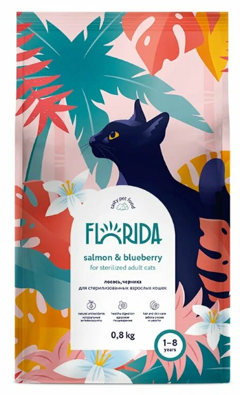 Купить Сухой корм для стерилизованных кошек Florida лосось, с черникой 800 г с доставкой по всей России. Сухой корм для стерилизованных кошек Florida лосось, с черникой 800 г: сравнение цен, характеристики, фото, актуальное наличие и цены.