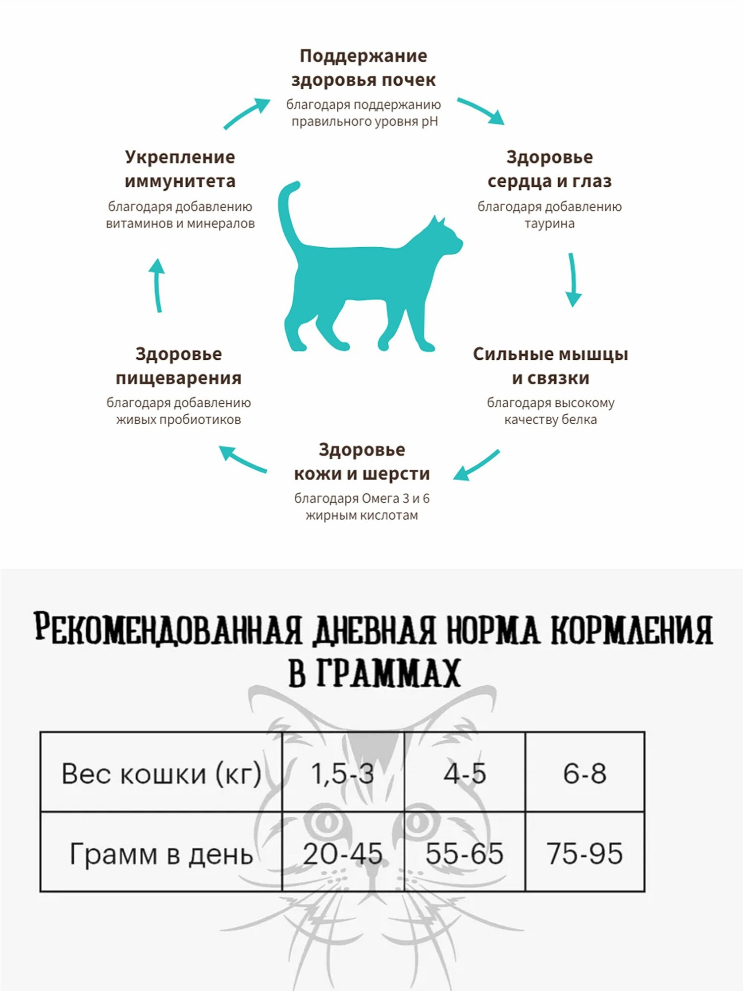 | Дозировка | для кошки среднего веса 4-5 кг: 55-65 г в день |