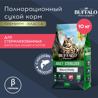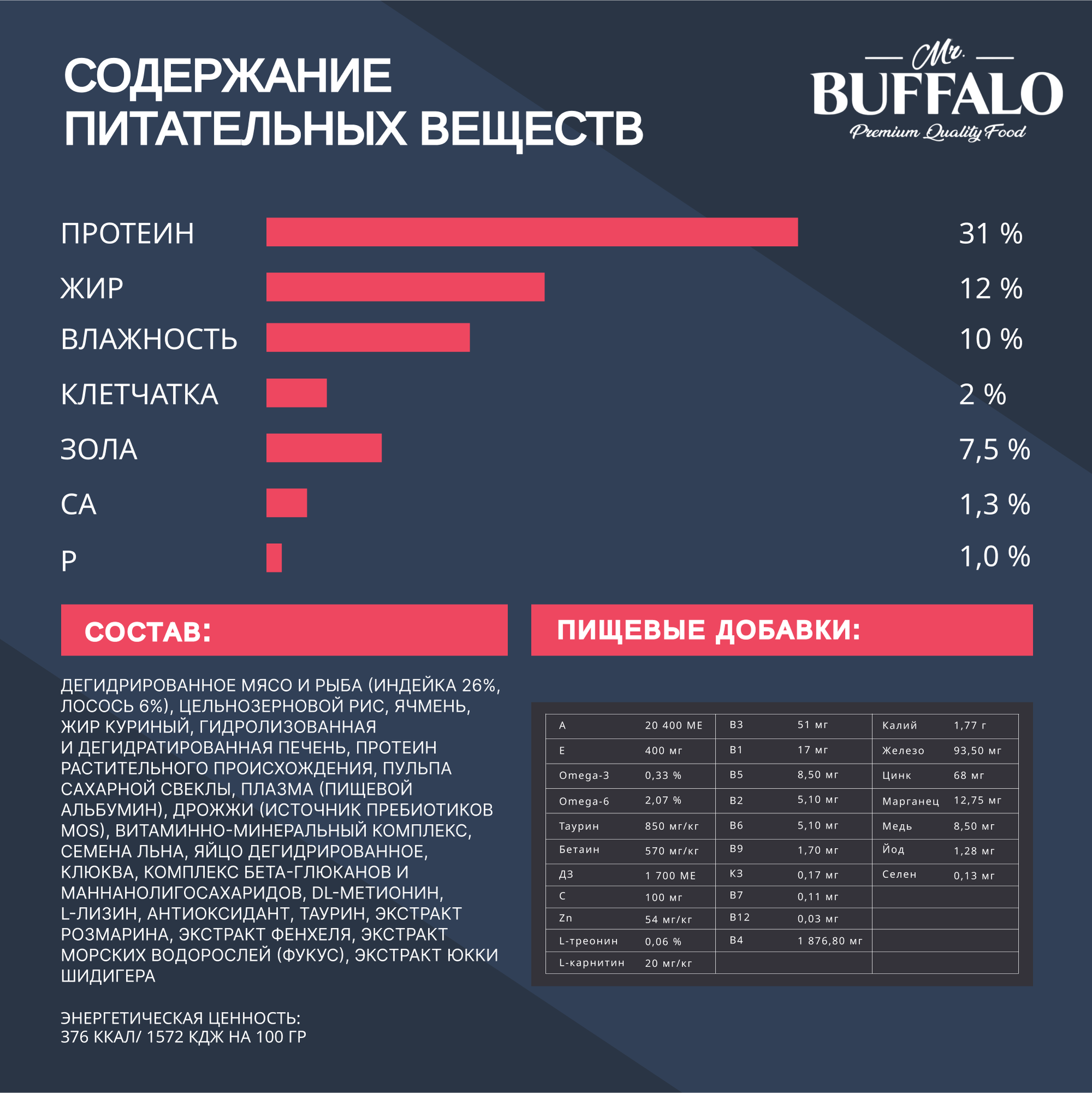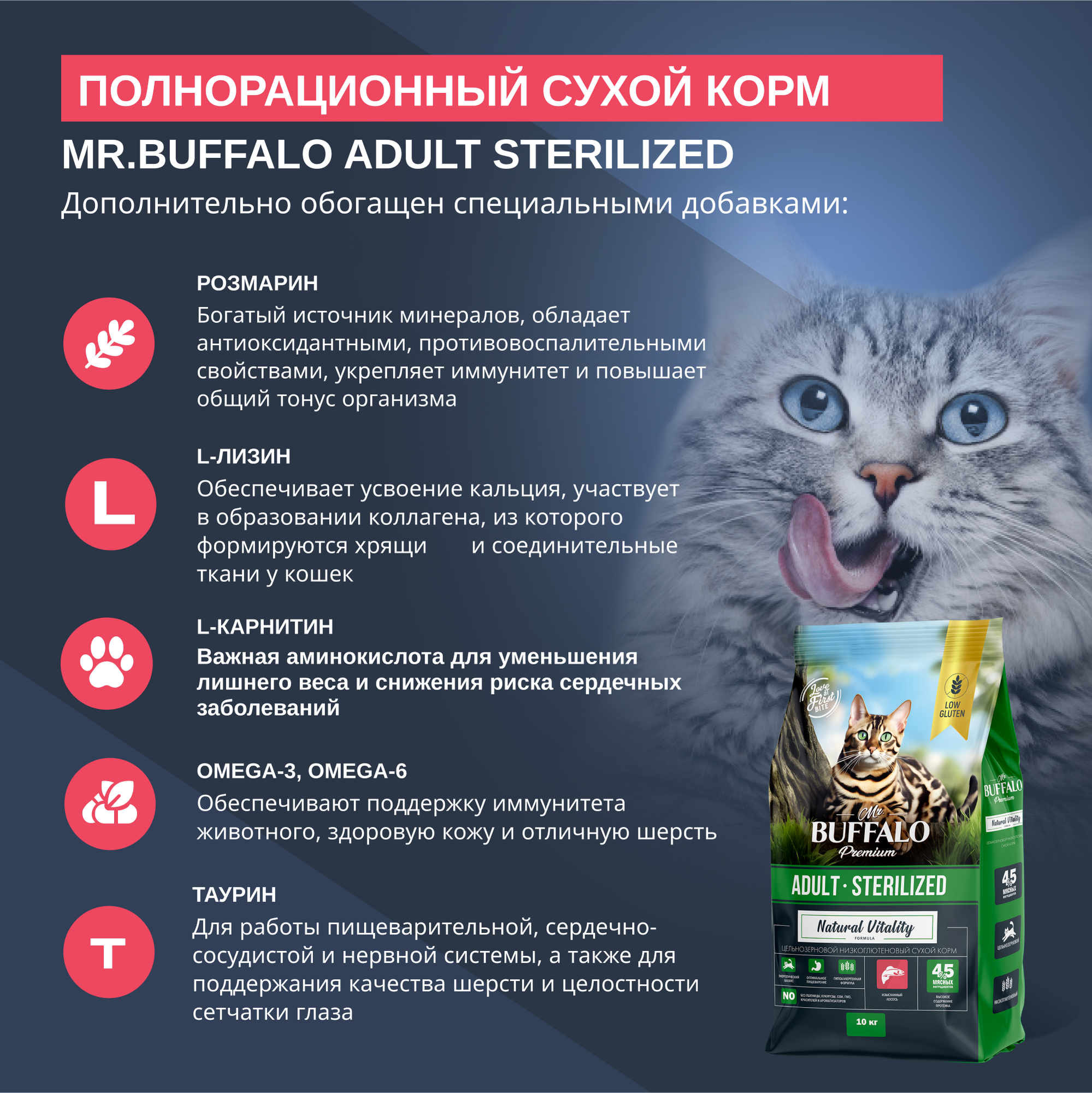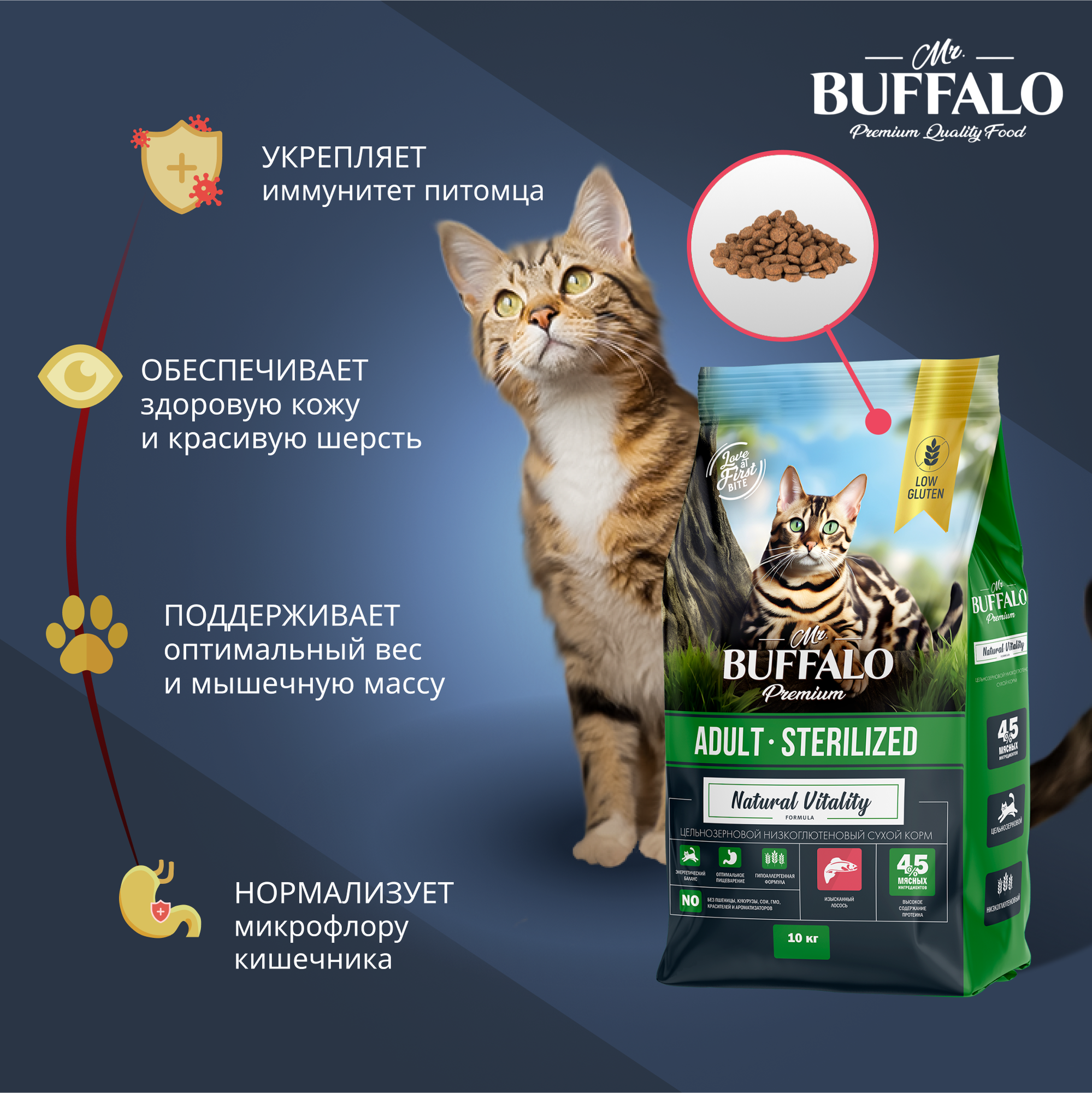 Полнорационный сухой корм премиум класса для стерилизованных котов и кошек Mr. Buffalo STERILIZED с лососем. Корм для кошек сухой Мистер Баффало разработан с учётом потребностей стерилизованных кошек и кастрированных котов, включает все необходимые питательные вещества для поддержания жизненных сил, здоровья мочевыделительной системы, поддержания оптимального веса и мышечной массы питомца. Именно на потребности стерилизованных кошек и котов рассчитан витаминно-минеральный премикс. Сбалансированный состав сухого корма обеспечивает прекрасную форму взрослых животных, препятствует набору лишнего веса, включает все необходимые питательные вещества для поддержания жизненных сил и здоровья вашего питомца. Одним из ключевых компонентов сухого корма Mr. Buffalo является уникальная запатентованная добавка Бета-глюкан, которая является натуральным иммуностимулятором. Бета-глюкан активизирует естественные функции организма кошек, помогает им бороться с инфекциями, поддерживает здоровое пищеварение, повышает сопротивляемость организма к бактериям, вирусам, грибкам и понижает риск различных заболеваний. Аминокислота DL-метионин в составе корма – отвечает за обмен жиров в организме, а также не позволяет жирам откладываться в печени и на стенках сосудов, клюква - обеспечивает здоровье мочеполовой системы и профилактику заболеваний МКБ. L-карнитин – важная аминокислота для уменьшения лишнего веса и снижения риска сердечных заболеваний. Mr. Buffalo специально разработан для удовлетворения энергетических потребностей стерилизованных кошек от 1 года. Изготовлен из высококачественных, легкопереваримых ингредиентов, имеет в составе высокий уровень антиоксидантов и витаминов. Зоотовары для котов и кошек с сбалансированным составом - наша главная задача.