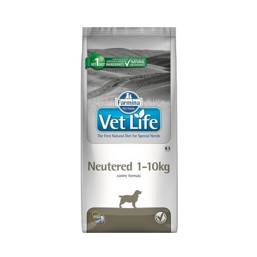 Vet Life Dog Neutered 1-10 kg Питание для стерилизованных собак весом до 10 кг. Farmina Vet Life Neutered 1-10kg ; полнорационный и сбалансированный сухой корм для взрослых кастрированных или стерилизованных собак весом до 10 кг для контроля веса и профилактики развития мочекаменной болезни. Контроль рН мочи. Контроль рН мочи достигается благодаря введению в рецептуру сульфата кальция. Таурин. Таурин поддерживает здоровье сердечно-сосудистой системы. L-карнитин. L-Карнитин преобразует жировые отложения в энергию и способствует сохранению мышечной массы. Оптимальный вес. Ограниченное содержание жира обеспечивает контроль веса, а повышенное содержание растительных волокон способствует эффекту насыщения. Изофлавоны. Изофлавоны ; натуральные фитоэстрогены, снижают последствия влияния половых гормонов на обмен веществ. Все продукты Farmina разработаны специалистами и протестированы на собаках и кошках в домашних условиях содержания. Механизм действия: Рацион с низким содержанием жира и высоким содержанием белка обеспечивает поддержание оптимальной массы тела. L-карнитин стимулирует окисление жиров и преобразование их в энергию. Низкое содержание углеводов снижает вероятность развития диабета. Сульфат кальция способствует контролю рН мочи и снижает риск развития мочекаменной болезни. Рекомендации по кормлению: Перед использованием и для продления срока использования рекомендуется обратиться за консультацией к ветеринарному врачу. Рекомендованное суточное количество корма указано в таблице. Дневная норма может меняться в зависимости от породы, условий содержания, физической нагрузки, от стадии и степени заболевания. Дневная норма может быть разделена на два и более кормлений. Собака должна иметь свободный доступ к свежей питьевой воде. Ингредиенты: дегидратированное куриное мясо, овес, пульпа сахарной свеклы, кукурузный глютен, дегидратированные цельные яйца, волокна гороха, куриный жир, дегидратированная рыба, льняное семя, рыбий жир, гидролизат животных белков, калия хлорид, растительное масло, подорожник, фруктоолигосахариды, маннанолигосахариды, сухие пивные дрожжи, сульфат кальция дигидрат (0,4%), хлорид натрия, экстракт сои (источник изофлавонов 600 мг/кг), глюкозамин, хондроитин сульфат, экстракт календулы (источник лютеина). Пищевые добавки на 1кг: Витамин А ; 18000 МЕ, Витамин D3 ; 1200 МЕ, Витамин Е ; 600 мг, Витамин С ; 300 мг, Ниацин ; 150 мг, Пантотеновая кислота ; 50 мг, Витамин В2 ; 20 мг, Витамин В6 ; 8,1 мг, Витамин В1 ; 10 мг, Витамин Н ; 1,5 мг, Фолиевая кислота ; 1,5 мг, Витамин В12 ; 0,1 мг, Холина хлорид ; 3000 мг, Бета-каротин ; 5 мг, Хелат цинка аналогичный метионин гидроксилазе ; 970 мг, Хелат марганца аналогичный метионин гидроксилазе ; 400 мг, Хелат железа гидрата глицина ; 185 мг, Хелат меди аналогичный метионин гидроксилазе ; 68 мг, Селенометионин ; 68 мг, Йодат кальция безводный ; 2,4 мг, L-лизин моногидрохлорид ; 1500 мг, DL-Метионин ; 3500 мг, Таурин ; 2000 мг, L-карнитин ; 350 мг. Специальные добавки: экстракт зеленого чая ; 100 мг, экстракт виноградных косточек ; 100 мг, микрокристаллическая целлюлоза. Антиоксиданты: экстракт токоферолов натурального происхождения ; 10 мг. Питательные вещества: сырой белок ; 33,00%, сырой жир ; 10,00%, сырая клетчатка ; 6,20%, сырая зола ; 7,90%, кальций ; 1,20%, фосфор ; 0,90%, натрий ; 0,35%, калий ; 0,60%, магний ; 0,10%, Омега-6 ; 1,40%, Омега-3 ; 0,25%, эйкозапентаеновая кислота (EPA) ; 0,05%, докозагекса
