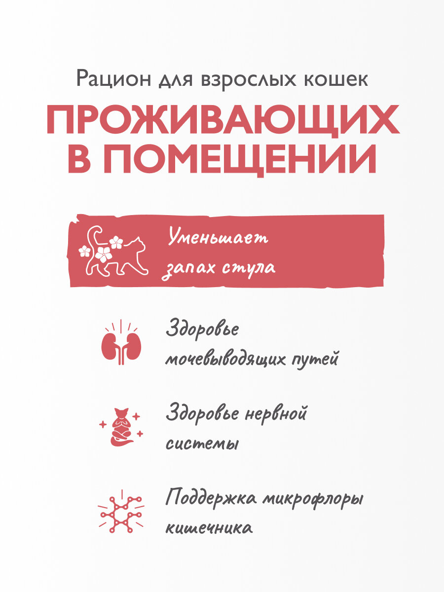 гипоаллергенный, для беременных / кормящих кошек, для вывода шерсти, для живущих в помещении, для живущих на улице, для здоровья кожи и блеска шерсти, для здоровья костей и суставов, для профилактики стресса, для снижения запаха стула, для стерилизованных/кастрированных, при чувствительном пищеварении, профилактика МКБ, профилактика зубного камня, профилактика избыточного веса