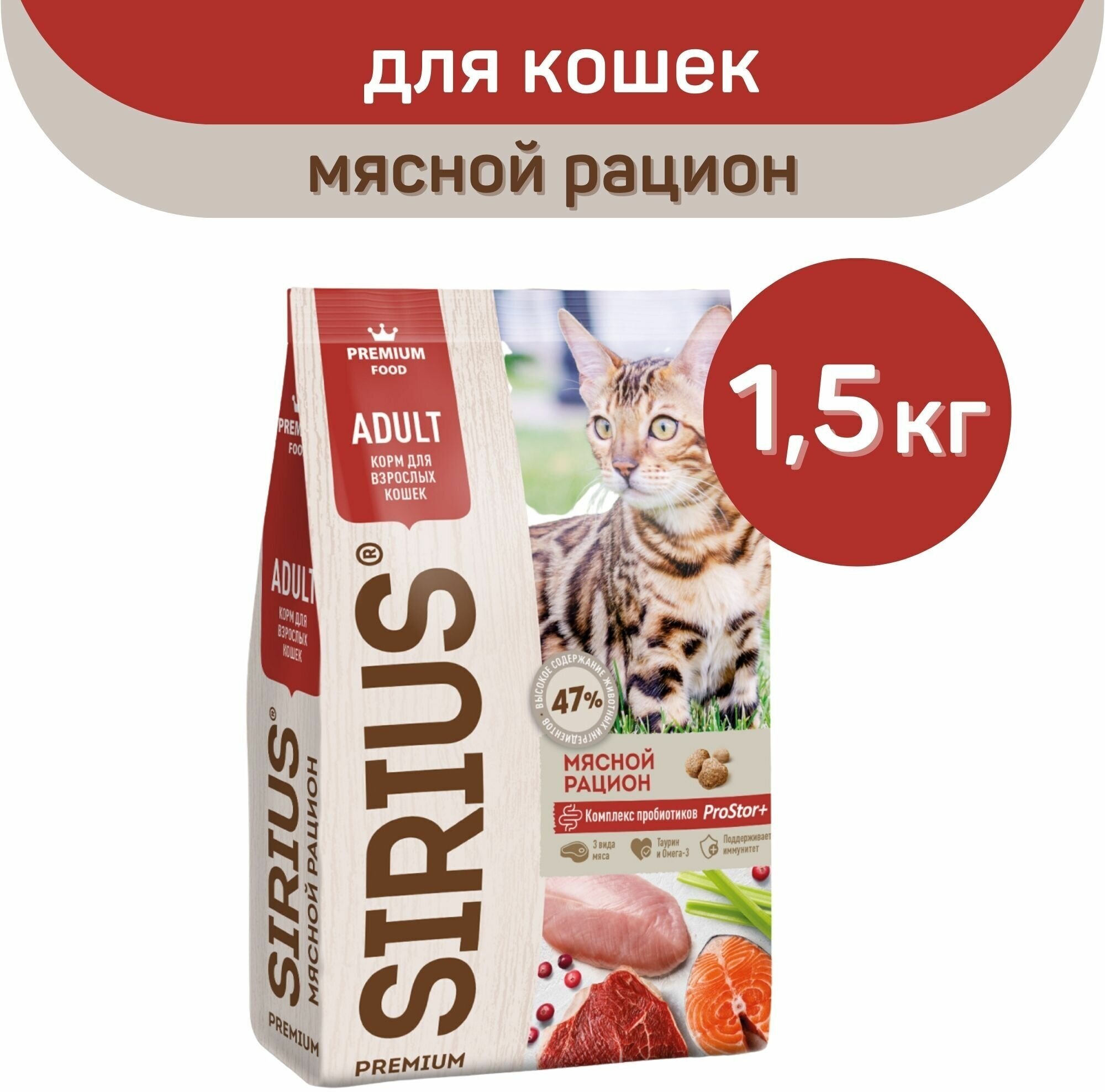 Sirius сухой корм для взрослых кошек, Мясной рацион, 1,5 кг.: сравнение цен, характеристики, фото, актуальное наличие и цены.