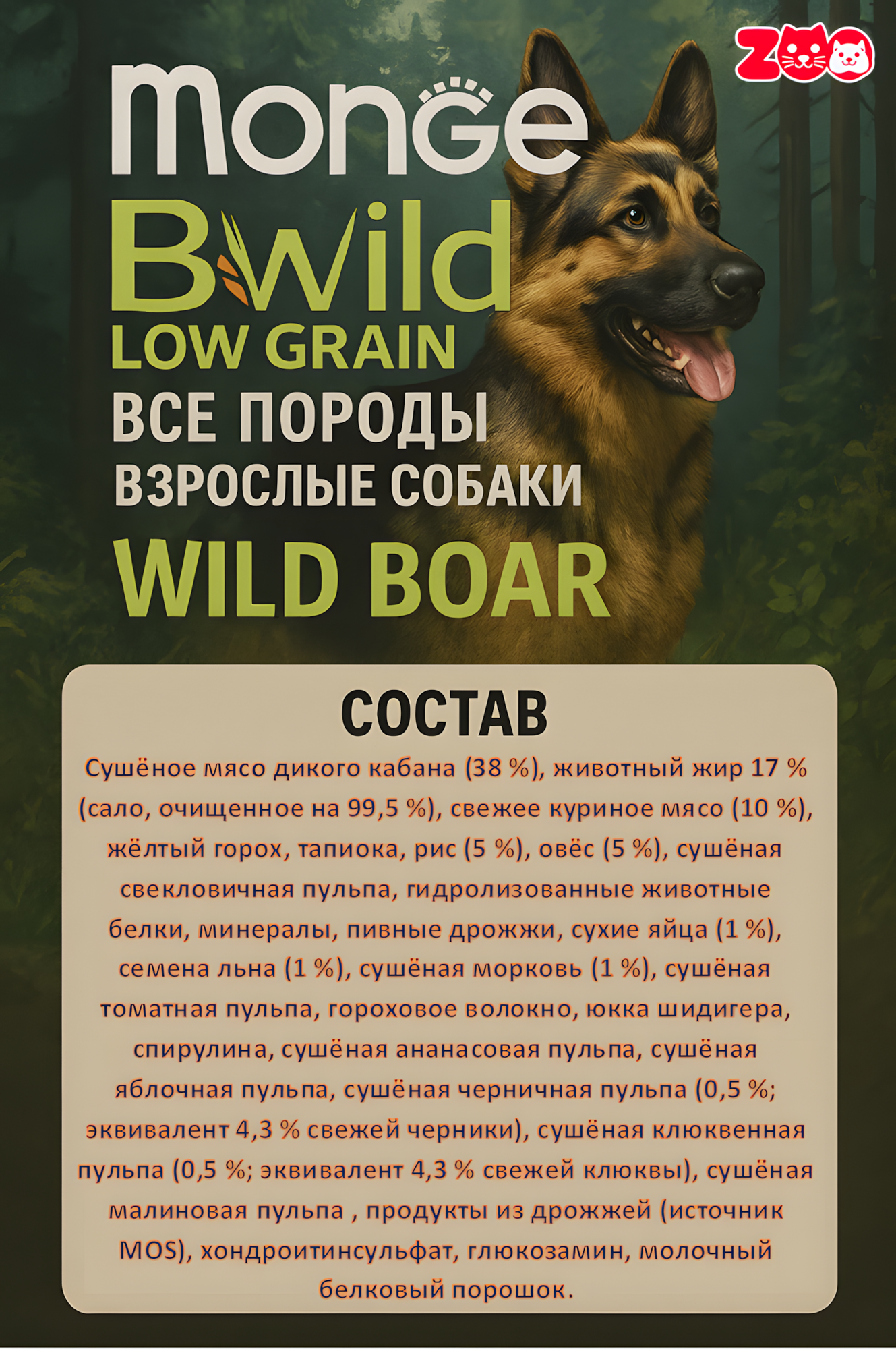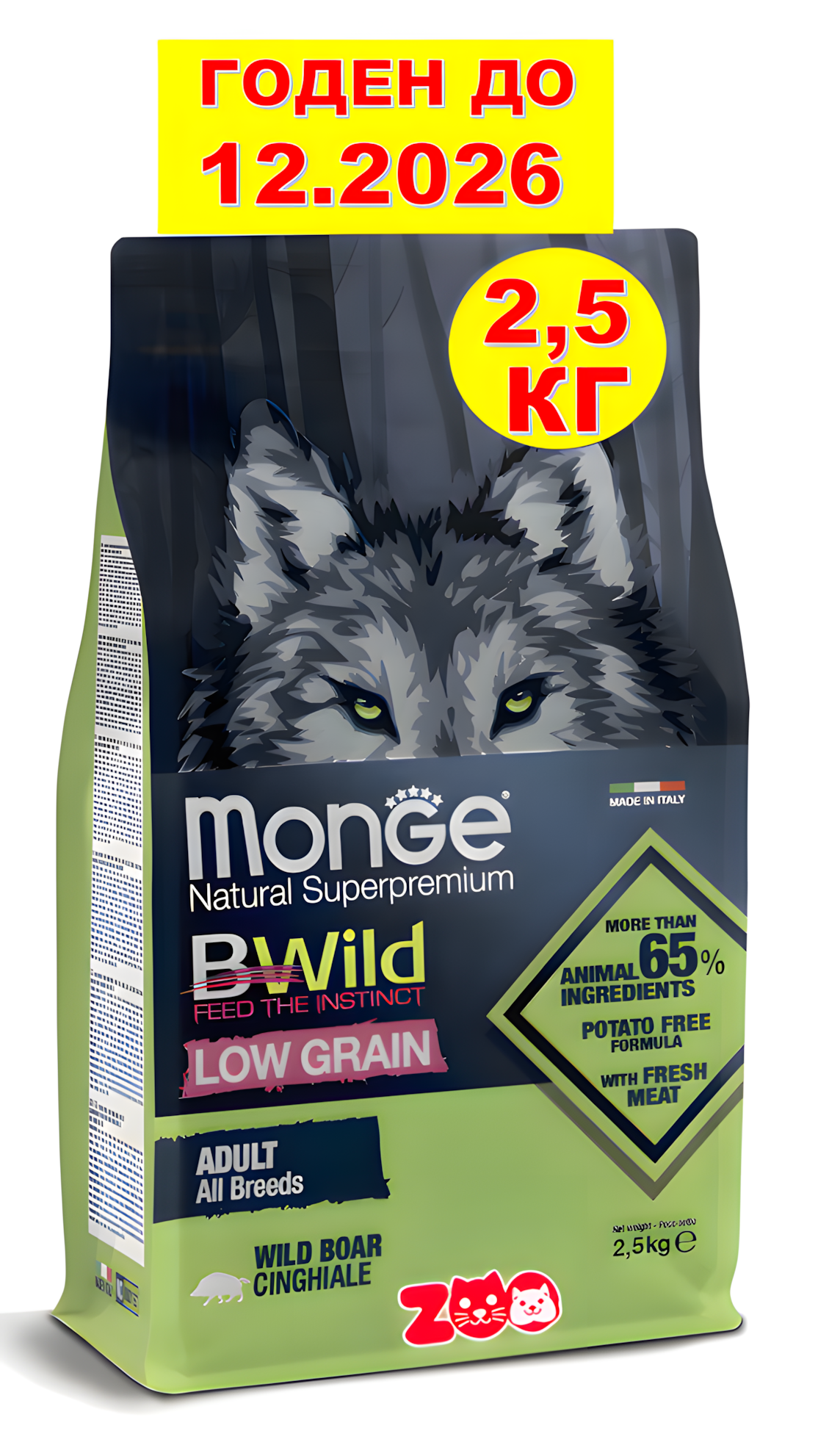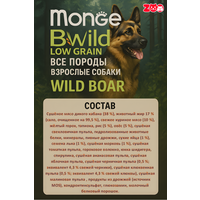 Сухой корм для взрослых собак Monge BWild LOW GRAIN Wild Boar (Монж Бивайлд) с мясом дикого кабана, 2,5 кг – низкозерновой рацион для всех пород