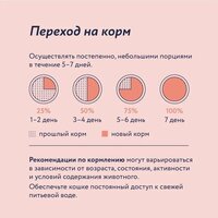 Переход с предыдущего рациона осуществлять постепенно, небольшими порциями в течение 5-7 дней. При кормлении необходимо учитывать активность и аппетит животного. Корм должен быть комнатной температуры. Содержимое открытой упаковки хранить при температуре +5°С и использовать в течение 2 дней. У кошки всегда должен быть доступ к свежей питьевой воде.