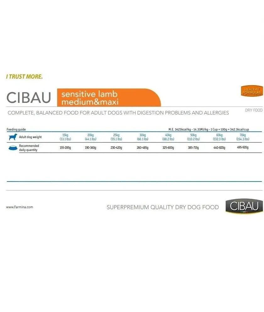 Farmina Cibau Sensitive Lamb Medium & Maxi корм для собак12 кг. Это сбалансированный корм для взрослых собак, содержащий витамины, минералы и другие вещества, необходимые для здоровья вашей собаки. Супер премиум корма для собак линии Cibau содержит все необходимые питательные вещества для обеспечения потребностей собак разных пород и возрастов, и обладает следующими характеристиками: