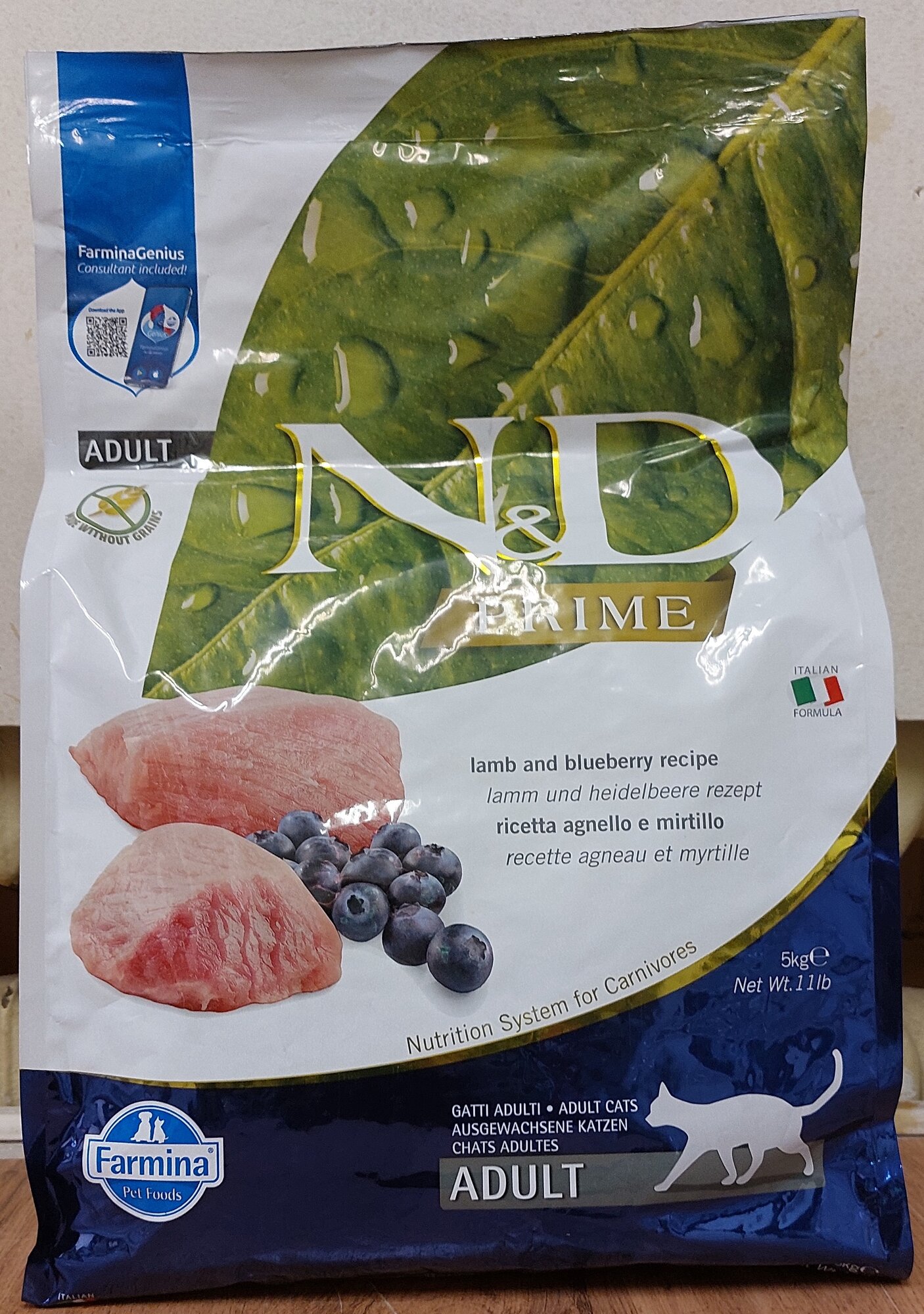 Сухой корм для взрослых кошек Farmina N&D Prime Adult Cat с ягнёнком и черникой, 5 кг — лучший выбор для здоровья и долголетия вашего питомца.