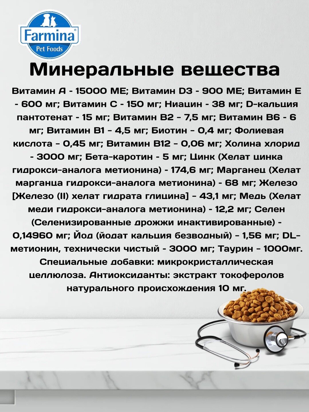 | Витамины | на 1 кг: А 15000 МЕ, D3 900 МЕ, Е 600 мг, С 150 мг, ниацин 38 мг, пантотеновая кислота 15 мг, В2 7,5 мг, В6 6 мг, В1 4,5 мг, Н 0,4 мг, фолиевая кислота 0,45 мг, В12 0,06 мг, холина хлорид 3000 мг; бета-каротин 5 мг |