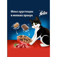 Любопытство Вашего кота заложено природой! И бренд Felix снова придумал, как его удовлетворить. Представляем Felix Двойная Вкуснятина – сухой корм для кошек, который полностью соответствует потребностям Вашего озорника. Восхитительное сочетание двух текстур в одной упаковке: хрустящие гранулы смешаны с мягкими кусочками для создания невероятного вкуса, перед которым невозможно устоять! Широкий ассортимент позволит коту наслаждаться разнообразием мясных или рыбных вкусов с соблазнительными ароматами. Felix Двойная Вкуснятина - первый сухой корм, созданный под брендом Felix для находчивого кота, который знает толк во вкусной еде. Не содержит искусственных красителей и консервантов Сочетание хрустящих гранул с мягкими и нежными кусочками 100% сбалансированный полный рацион Содержит витамины А, Д, Е и таурин Совет от Felix: Вы пробовали комбинировать сухой и влажный корм в ежедневном рационе Вашего кота? Попробуйте! Ведь теперь Felix доступен в обоих рационах. Рекомендации по кормлению: Рекомендуемая суточная норма зависит от погодных условий, уровня активности кошки и ее физических особенностей. Индивидуальные потребности кошки могут варьироваться, и ежедневное количество корма должно быть скорректировано по мере необходимости для поддержания оптимального веса Вашей кошки. Следите, чтобы у Вашей кошки всегда была свежая чистая питьевая вода. Достаточное ежедневное потребление воды - обязательное условие здоровья Вашего питомца. Состав товара: Злаки, мясо и продукты переработки мяса (мин. 4% мяса на базе восстановленного вещества), продукты переработки растительного сырья, масла и жиры, экстракты растительного белка, глицерол, консерванты, минеральные вещества, дрожжи, сахара, аминокислоты, витамины, красители, антиоксиданты. Гарантируемые показатели: белок: 34%, содержание жира: 12,5%, сырая зола: 8%, сырая клетчатка: 3%, незаменимые жирные кислоты: 2,5%. Добавленные вещества: мг/кг : Железо : 39; Йод : 1,3; Медь : 7,4; Марганец : 4,2; Цинк : 55; Селен : 0,089; Таурин : 730 МЕ/кг : Витамин А : 10 000; Витамин Д3 : 860; Витамин Е : 74.