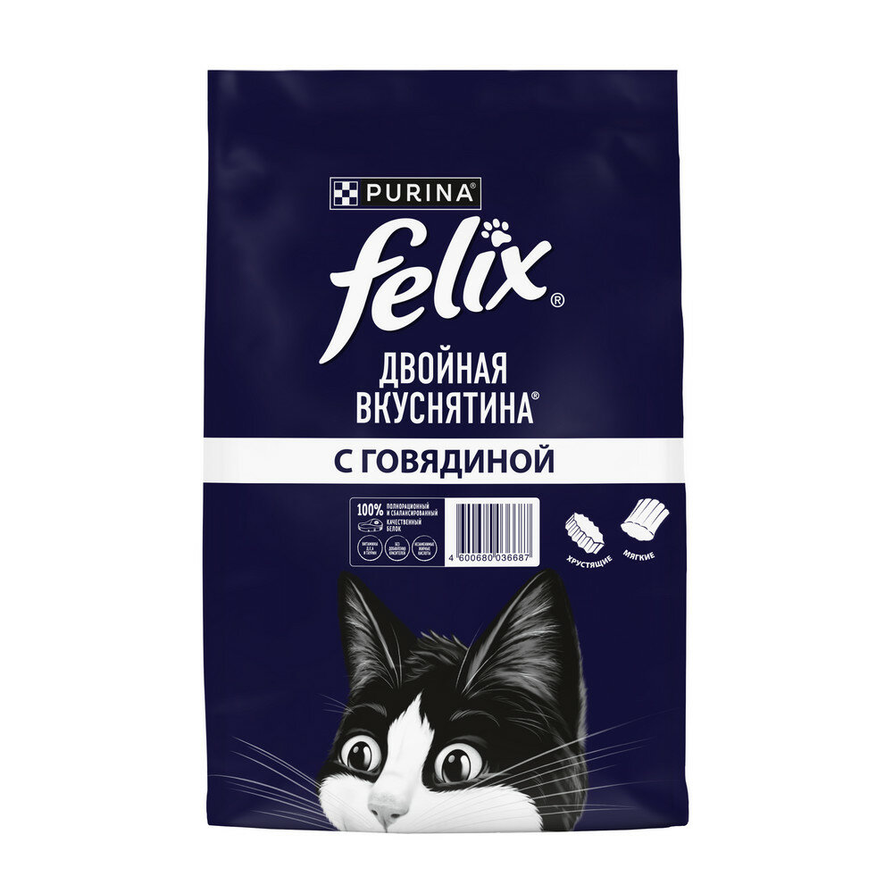 Любопытство Вашего кота заложено природой! И бренд Felix® снова придумал, как его удовлетворить. Представляем FELIX® Двойная Вкуснятина® – сухой корм для кошек, который полностью соответствует потребностям Вашего озорника. Восхитительное сочетание двух текстур в одной упаковке: хрустящие гранулы смешаны с мягкими кусочками для создания невероятного вкуса, перед которым невозможно устоять! FELIX® Двойная Вкуснятина® – первый сухой корм, созданный под брендом FELIX® для находчивого кота, который знает толк во вкусной еде. И это еще не все! Корм FELIX® Двойная Вкуснятина® содержит оптимальное сочетание сбалансированных минеральных веществ и витаминов, которые на 100% удовлетворят ежедневные потребности Вашего питомца в правильном питании.