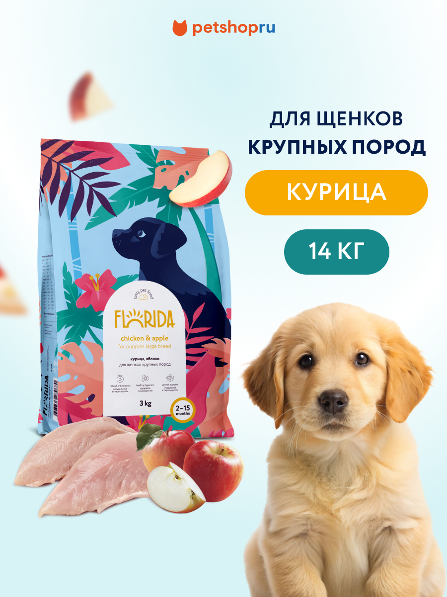 Florida Chicken and AppleВ - сухой корм супер-премиум-класса с курицей и яблоком для щенков крупных пород. Сбалансированное полнорационное питание, способствующее правильному развитию щенка. В В рационе кормов Florida используется только белок животного происхождения.