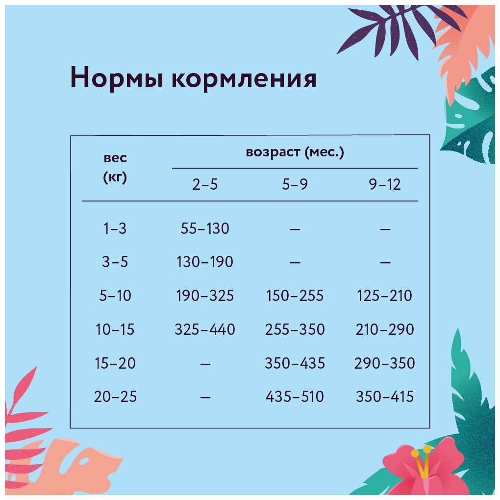 Нормы кормления являются ориентировочными и могут варьироваться в зависимости от возраста, породы, комплекции и уровня активности питомца. Свежая питьевая вода всегда должна быть в свободном доступе.