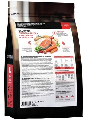 Состав: Филе лосося, филе трески, измельченное, сушеное мясо лосося, измельченное, сушеное мясо сельди, горох, чечевица, цельные сушеные яйца, картофель, куриный жир (с токоферолами в качестве консерванта), натуральный ароматизатор, филе форели, тапиока, лососевый жир, сушеный корень цикория, клюква, яблоки, морковь, дикальция фосфат, продукт ферментации высушенных Lactobacillus acidophilus, продукт ферментации высушенных Enterococcus faecium, фосфорная кислота, холин хлорид, хлористый калий, хлористый натрий, витамины (пищевая добавка витамин А, пищевая добавка витамин D3, пищевая добавка витамин Е, ниацин, L-аскорбил-2-полифосфат (источник витамина С), тиамин мононитрат, D-пантотенат кальция, рибофлавин, пиридоксина гидрохлорид, бета-каротин, фолиевая кислота, биотин, пищевая добавка витамин B12), минералы (протеинат цинка, железа протеинат, протеинат меди, оксид цинка, марганца протеинат, сульфат меди, йодат кальция, сульфат железа, оксид марганца, селенит натрия), продукт ферментации высушенных Aspergillus oryzae, продукт ферментации высушенных Bacillus subtilis, DL-метионин, таурин, экстракт юкки шидигера, сушеный розмарин.