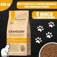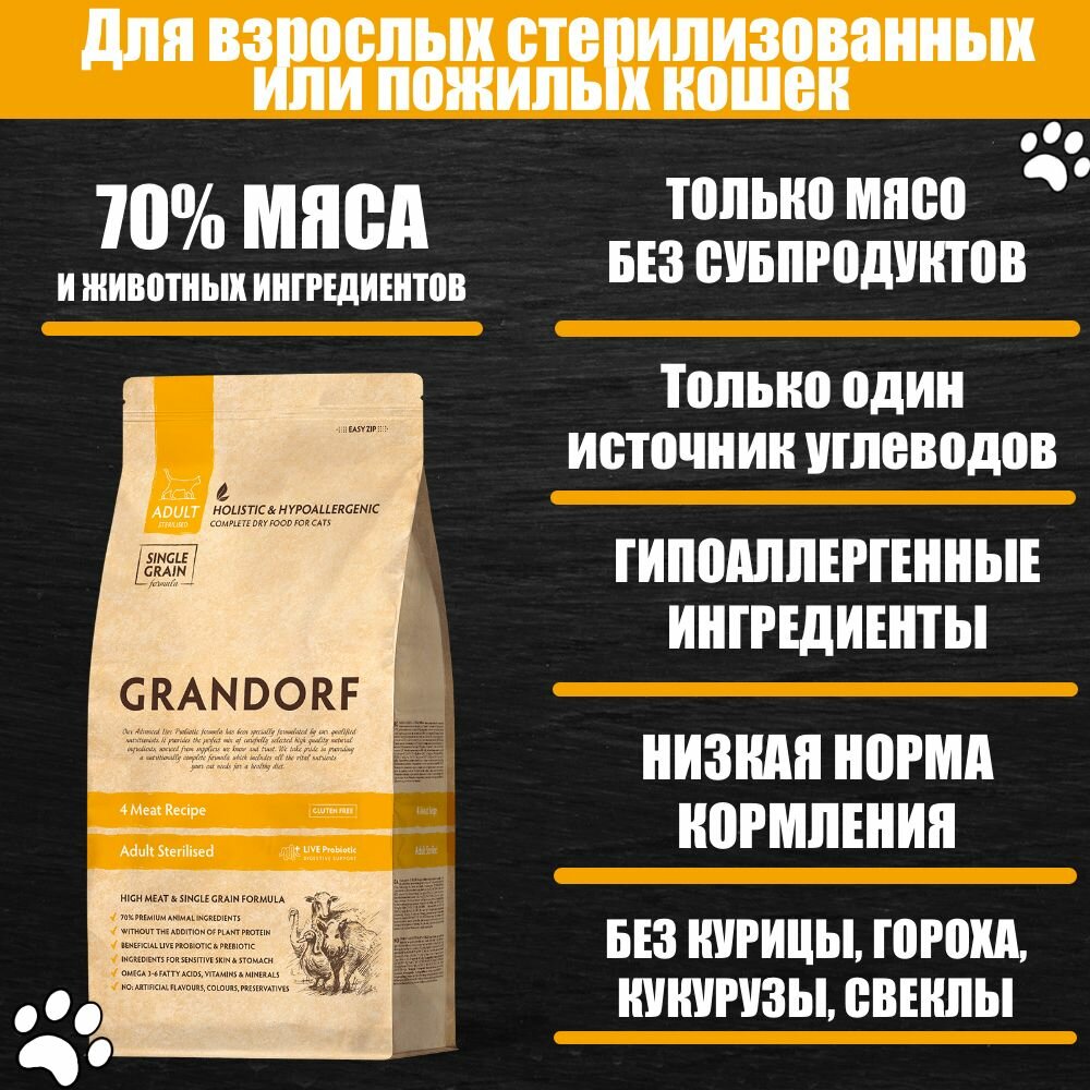Сухой корм Grandorf 4 Meat Sterilised для стерилизованных кошек Мясное ассорти, 400 г.: сравнение цен, характеристики, фото, актуальное наличие и цены.