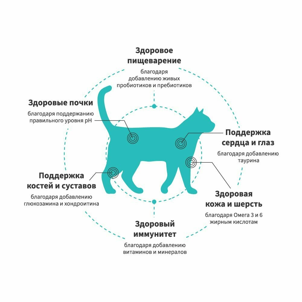 беззерновой, гипоаллергенный, для беременных / кормящих кошек, для вывода шерсти, для живущих в помещении, для живущих на улице, для здоровья кожи и блеска шерсти, для здоровья костей и суставов, для определенных пород, для профилактики стресса, для снижения запаха стула, для стерилизованных/кастрированных, при диабете, при чувствительном пищеварении, профилактика МКБ, профилактика зубного камня, профилактика избыточного веса