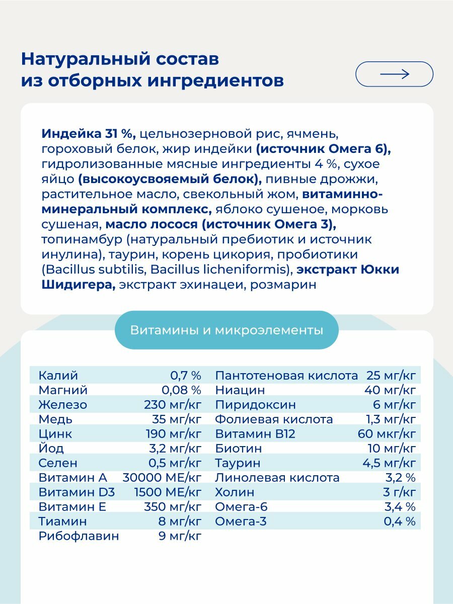 1. Индейка (31%) – единственный источник животного белка в составе корма для котят сухого. Монобелковый рацион незаменим для животных, страдающих аллергией на определенный вид животного белка и склонностью к чувствительному пищеварению.