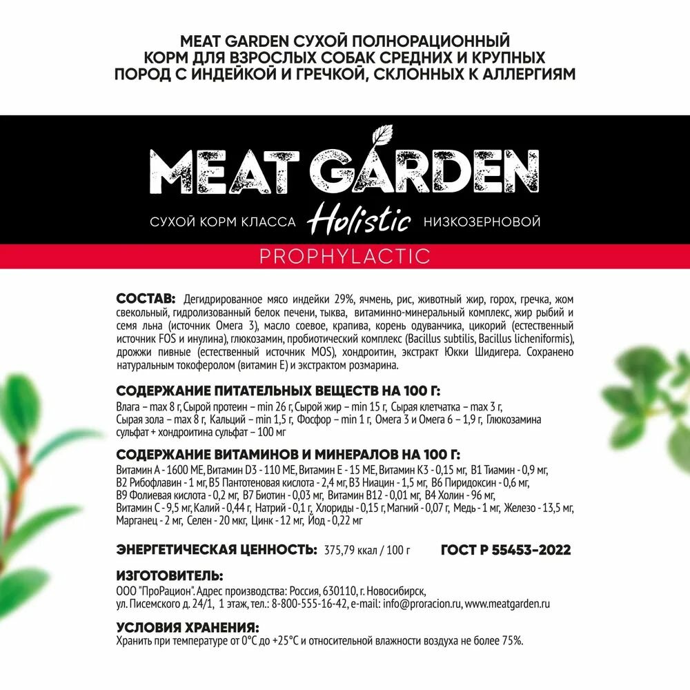 Сухой корм Meat Garden для собак средних и крупных пород склонных к аллергиям с индейкой и гречкой 12 кг: сравнение цен, характеристики, фото, актуальное наличие и цены.