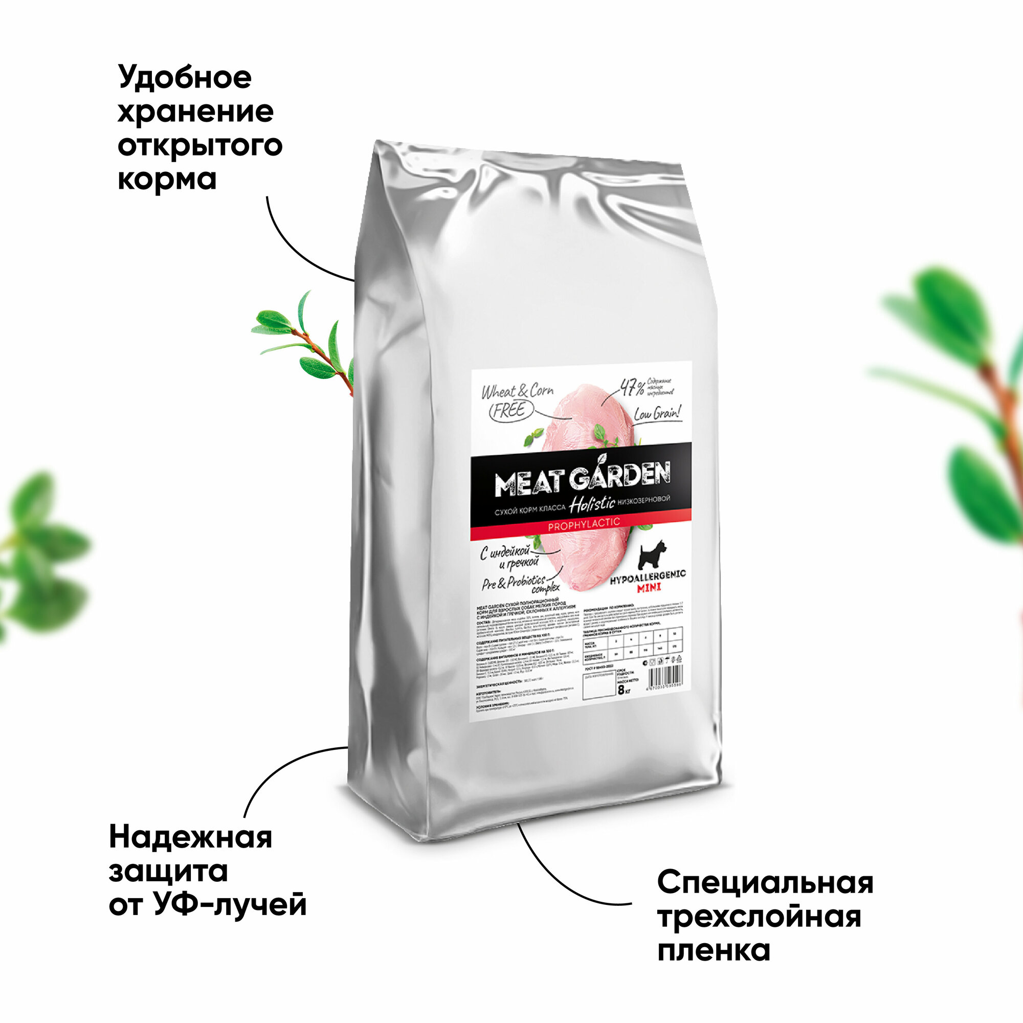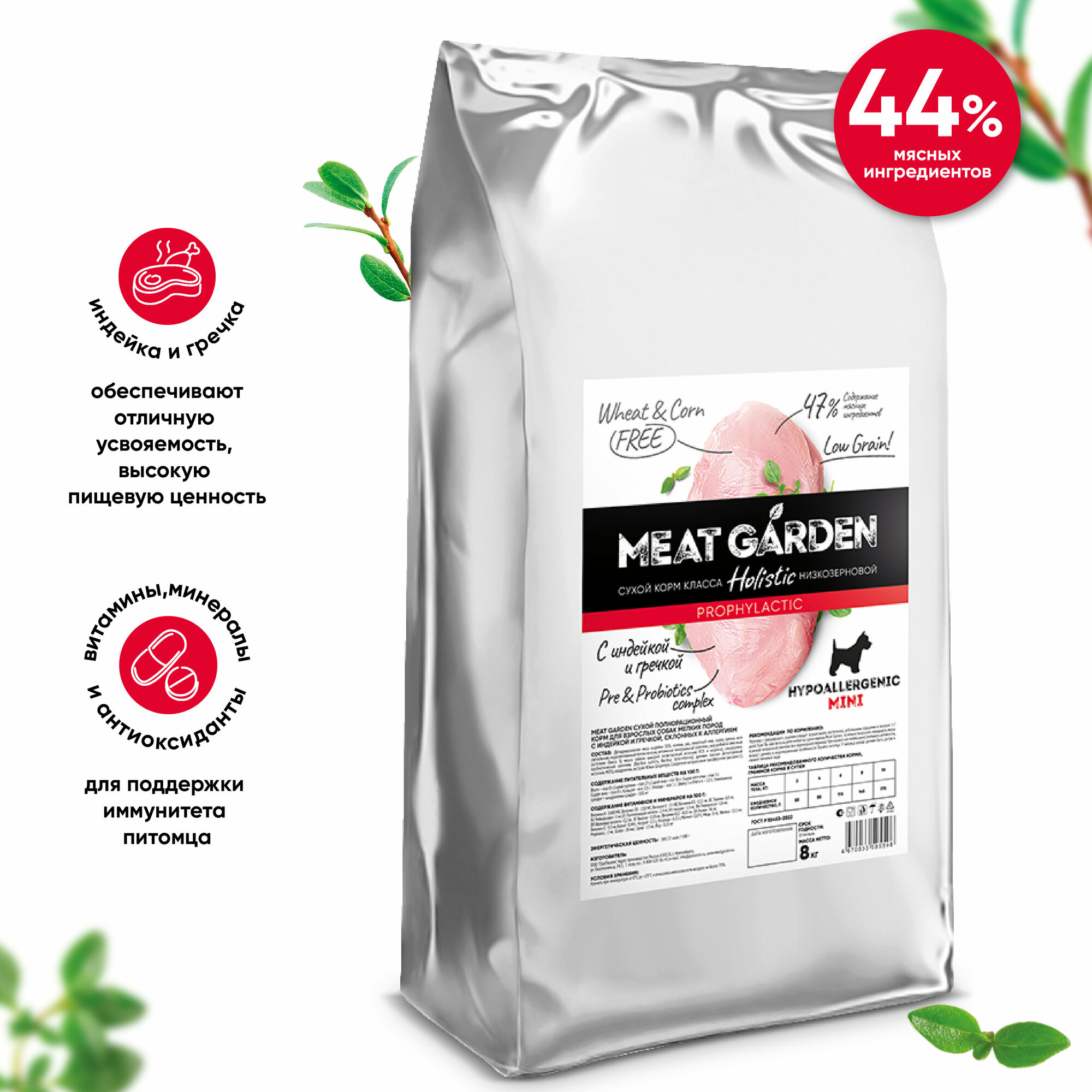 Во всех кормах MEAT GARDEN отсутствует пшеница и кукуруза. Источником углеводов является рис или гречка. Данные ингредиенты не содержат глютен и являются более гипоаллергенными, а также имеют высокую пищевую усвояемость и хорошо влияют на органолептику корма. В рисе и гречке содержится большое количество полезных витаминов, минералов, микро- и макроэлементов, которые укрепляют иммунитет, положительно влияют на пищеварительную систему и общее самочувствие питомца.
