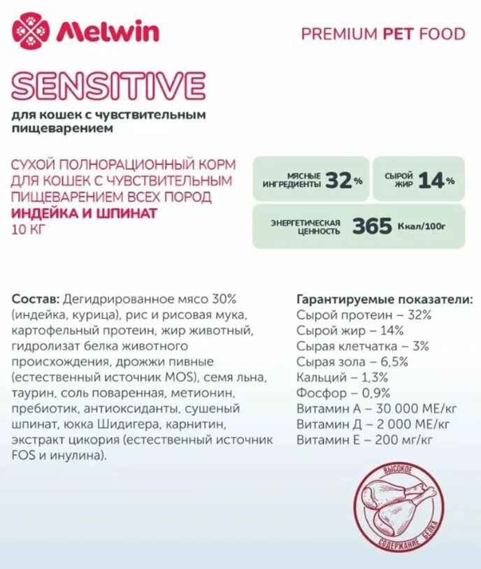 Сухой полнорационный корм для кошек всех пород MELWIN с индейкой и шпинатом разработан с учетом физиологических особенностей животных, возраста, образа жизни, для здоровья вашего питомца «от носа до хвоста».