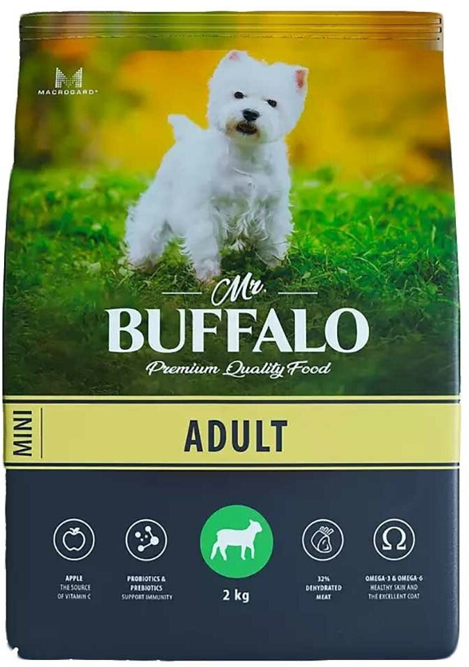 Корм для собак сухой полнорационный премиум класса для миниатюрных пород Mr. Buffalo Sensitive Lamb Mini с ягненком для взрослых собак миниатюрных пород пород с чувствительным пищеварением. Основу рациона составляет мясо ягнёнка и рис, обладающие низким аллергенным потенциалом, легко перевариваются, снижая нагрузку на пищеварительный тракт. Рацион, разработан специально для кормления взрослых собак с чувствительным пищеварением, склонных к аллергическим реакциям, а также для собак, которым необходима смена вкусовых качеств их повседневного рациона. Формула рациона с ягненком богата высококачественным белком и способствует поддержанию оптимального пищеварения, которое позволяет вашему питомцу эффективно усваивать питательные вещества. Сухой корм для собак Мистер Баффало Мини сенситив с ягненком содержит оптимальное количество белков, жиров и углеводов, что делает корм для собак подходящим для мелких и миниатюрных пород. Именно на потребности мелких и миниатюрных пород собак рассчитан и витаминно-минеральный премикс. Сбалансированный состав сухого корма для собак обеспечивает прекрасную форму взрослых животных и препятствует набору лишнего веса. Одним из ключевых компонентов сухого корма Mr.Buffalo является уникальная запатентованная добавка MacroGard (МакроГард), которая является натуральным иммуностимулятором. MacroGard (МакроГард) активизирует естественные функции организма кошек и собак, помогает им бороться с инфекциями, поддерживает здоровое пищеварение, повышает сопротивляемость организма к бактериям, вирусам, грибкам и понижает риск различных заболеваний. Важная аминокислота L-лизин обеспечивает усвоение кальция, участвует в образовании коллагена, из которого затем формируются хрящи и соединительные ткани у щенков и собак. Яблоки источник полезной клетчатки. Помогают пищеварению, выводят из кишечника токсичные вещества. Также в яблоках содержится много кальция, калия, марганца, железа, витаминов и антиоксидантов. Топинамбур - источник инулина, обладает желчегонным действием, улучшает обмен веществ, укрепляет иммунную защиту, способствует нормализации микрофлоры кишечника. Омега-3, Омега-6 - обеспечивают поддержку иммунитета животного, здоровую кожу и отличную шерсть. Зоотовары для собак с сбалансированным составом - наша главная задача.