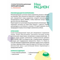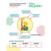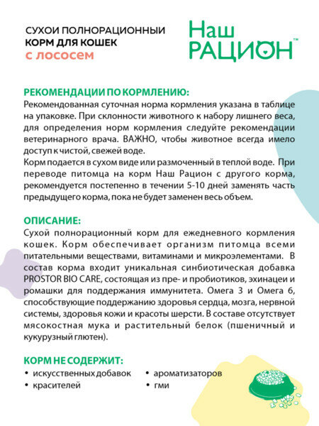 Наш Рацион - сухой корм класса Стандарт для полноценного ежедневного рациона, не содержит мясокостной муки, искусственных добавок, красителей, ароматизаторов и ГМО. Качественная и бережная обработка сырья для сохранности полезных питательных веществ корма, позволяет легко перевариваться и усваиваеваться в организме. Уникальная добавка ProStor Bio Care – это комплекс пробиотиков и пребиотиков четвертого поколения, способствующий восстановлению микрофлоры кишечника, поглощает токсины и поддерживает иммунную систему организма. Сухой полнорационный корм для ежедневного кормления кошек. Корм обеспечивает организм питомца всеми питательными веществами, витаминами и микроэлементами. В состав корма входит уникальная синбиотическая добавка PROSTOR BIO CARE, состоящая из пре- и пробиотиков, эхинацеи и ромашки для поддержания иммунитета. Омега 3 и Омега 6 способствуют поддержанию здоровья сердца, мозга, нервной системы, здоровья кожи и красоты шерсти. В составе отсутствует мясокостная мука и растительный белок (пшеничный и кукурузный глютен). Рекомендация по кормлению: Питомцев начинают приучать к новой пище с 3-4 недель. В первое время сухие корма необходимо смачивать водой или молоком. По мере подрастания, постепенно уменьшают количество жидкости. После отъёма от матери необходимо кормить специальными кормами, предназначенными для растущего организма Далее переход по схеме. Необходимо постоянное наличие воды