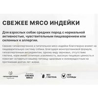 Свежее гипоаллергенное и питательное мясо индейки благотворно влияет на пищеварительную систему собаки. Благодаря монопротеиновой формуле, гипоаллергенным ингредиентам, одному виду зерновых, отсутствию глютена, корм имеет отличную усвояемость, высокую пищевую ценность и помогает оставаться вашему питомцу здоровым и жизнерадостным на протяжении долгих лет жизни.