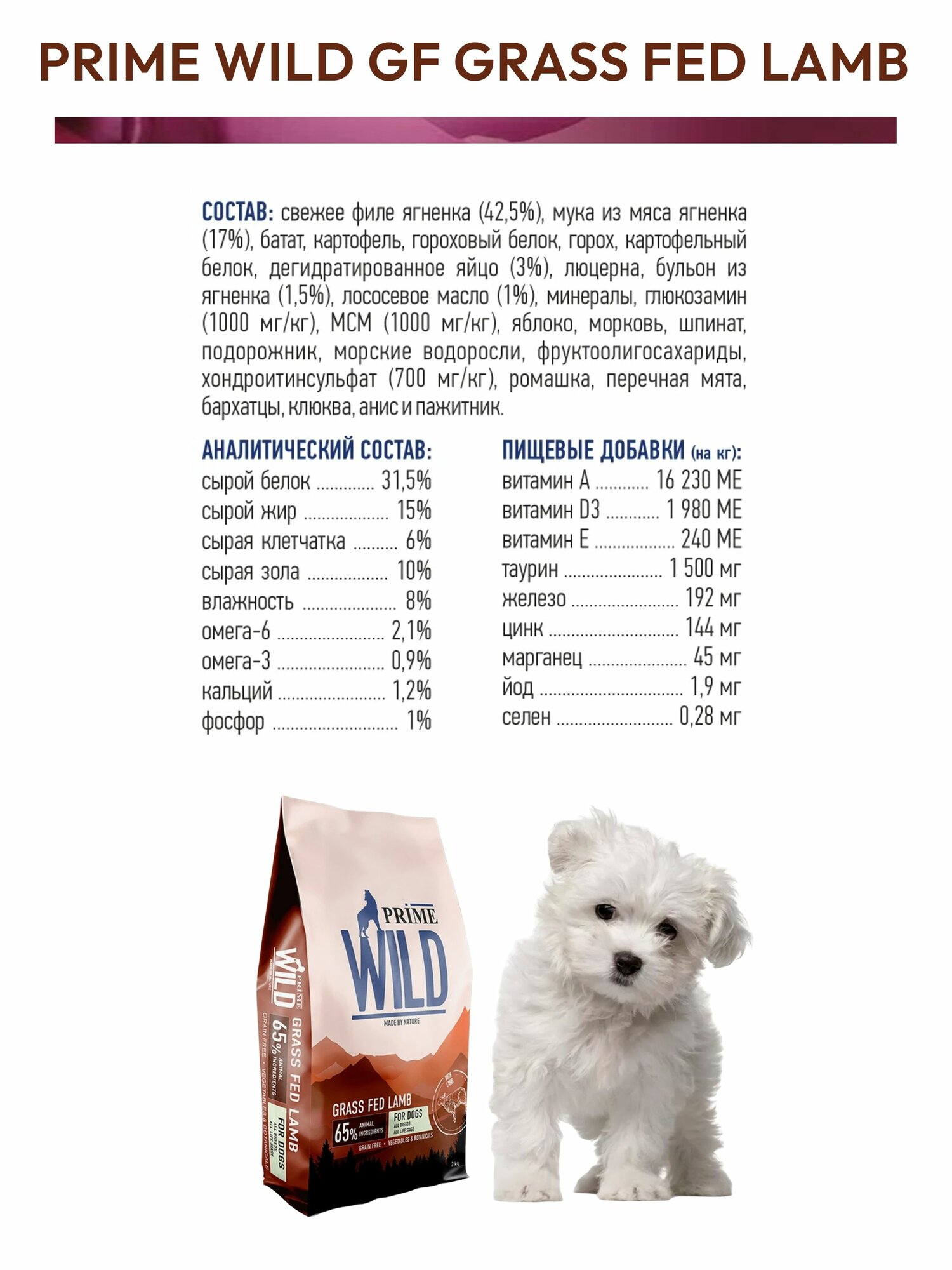 Сухой корм PRIME WILD GF GRASS FED LAMB для щенков и собак всех пород с ягненком 2кг.