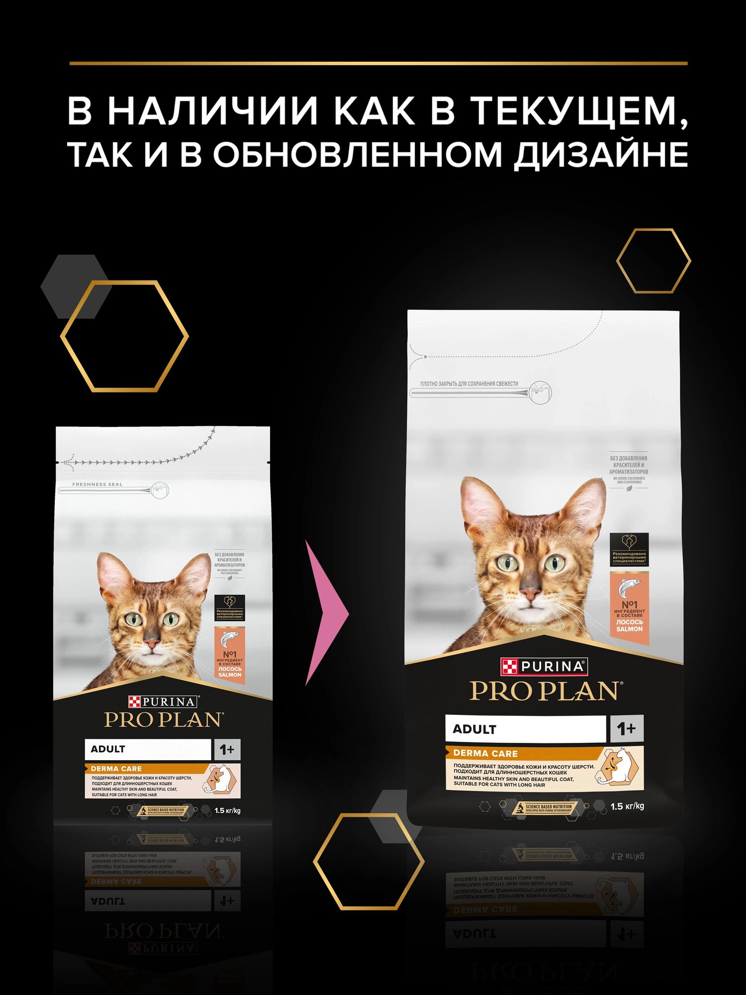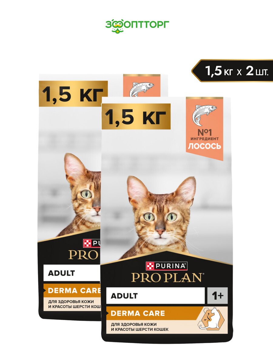 Сухой корм Pro Plan Derma Care Adult для кошек для поддержания красоты шерсти и здоровья кожи Лосось, 1,5 кг х 2 шт.: сравнение цен, характеристики, фото, актуальное наличие и цены.