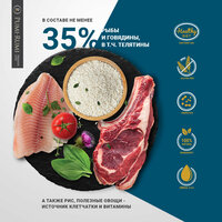 состав: рыба и говядина 35% (рыбы не менее 26%, говядины не менее 9%), крупа рисовая, ячмень, жом сахарной свеклы, пивные дрожжи, животный жир, витаминно-минеральный комплекс для собак, холин хлорид, сухой цикорий, топинамбур, волокна подорожника, расторопша, томат сушёный, юкка Шидигера, L-карнитин.