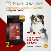 Сухой корм PUMI-RUMI PREMIER LINE для собак средних пород с говядиной, индейкой и рисом 2кг, суперпремиум, гранула 12 мм.