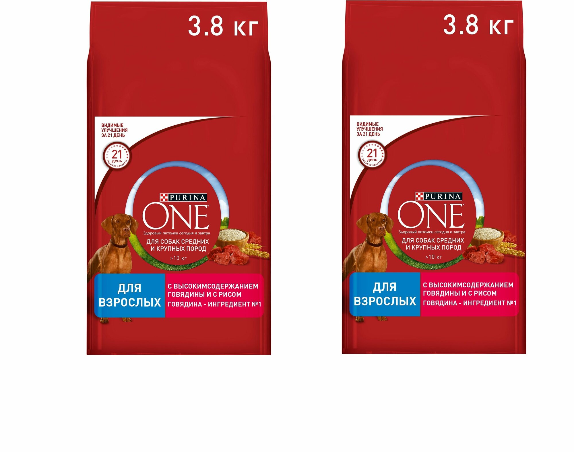 Купить Сухой корм Purina ONE для взрослых собак средних и крупных пород, с высоким содержанием говядины и с рисом, пакет, 3,8 кг, 2 шт с доставкой по всей России.