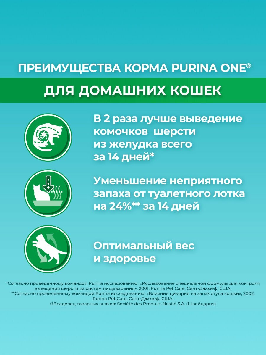 Домашние кошки проводят много времени, ухаживая за своей шерстью, что часто приводит к образованию волосяных комков в желудке, которые могут доставить дискомфорт. Также они ведут менее активный образ жизни. В результате их потребность в энергии снижается и они становятся склонными к набору лишнего веса. Корм Purina ONE® (Пурина Уан) разработан специально для кошек, живущих в домашних условиях, и способствует уменьшению образования комочков шерсти в желудке. Способствует выведению комочков шерсти из желудка благодаря наличию клетчатки. Формула с содержанием цикория, высококачественного натурального ингредиента, помогает уменьшить неприятный запах от туалетного лотка, способствует балансу микрофлоры кишечника и поддерживает здоровую пищеварительную систему. Благодаря оптимальному соотношению белков и жиров корм помогает поддерживать здоровье кошки.