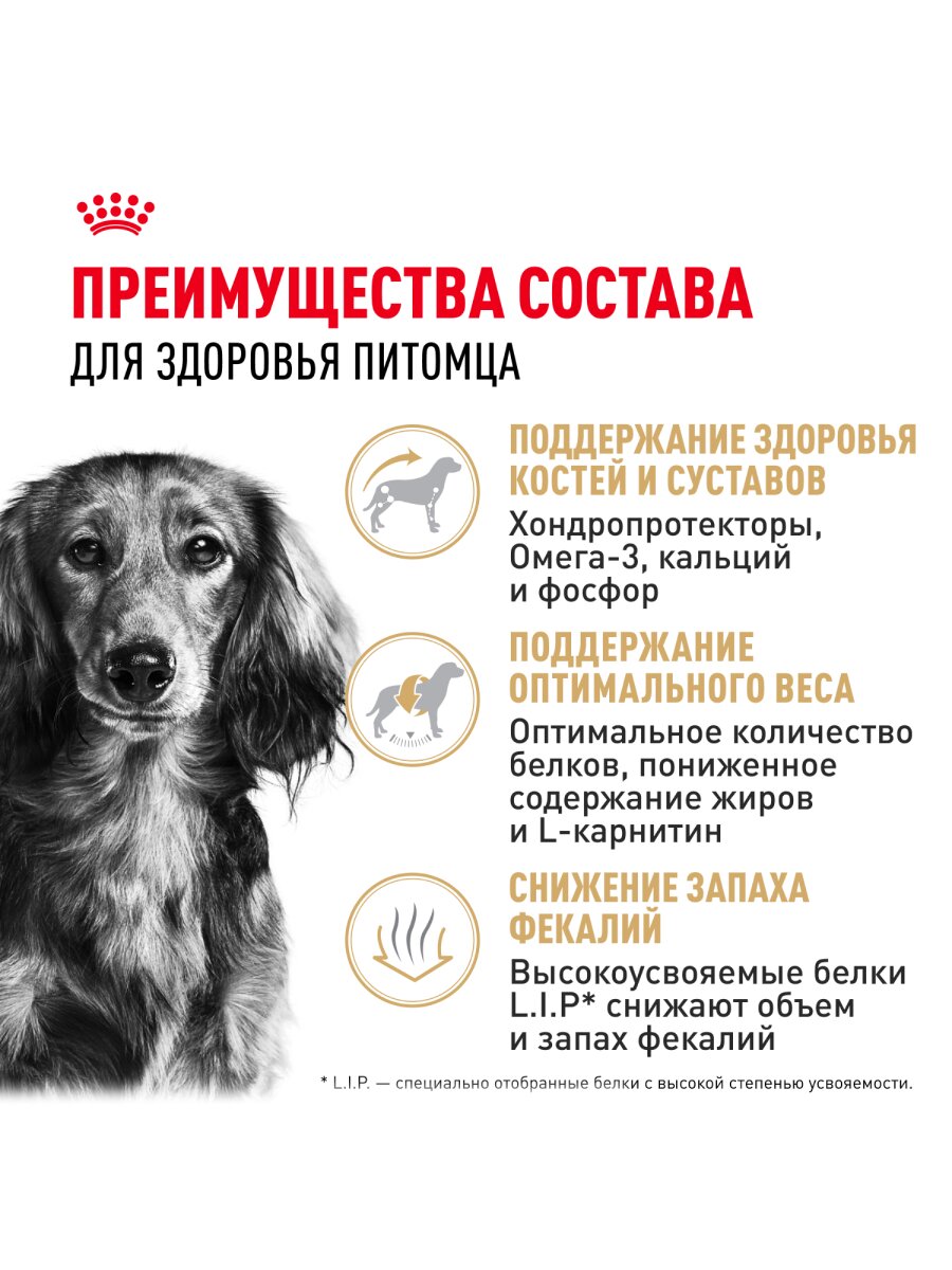 Таксы – дружелюбные, умные и верные собаки, заслуженно получившие репутацию идеальных семейных компаньонов. Поскольку каждой породе свойственны свои особенности, важно выбрать питание, наилучшим образом способствующее поддержанию животного в хорошей форме. Корм ROYAL CANIN Dachshund Adult, предназначенный для собак породы такса старше 10 месяцев, разработан специально с учетом всех потребностей вашей взрослой собаки в питательных веществах для поддержания ее здоровья и хорошего самочувствия. Благодаря адаптированному содержанию кальция и фосфора корм ROYAL CANIN Dachshund Adult способствует укреплению костей, а хондропротекторы поддерживают суставы таксы. Кроме того, эксклюзивная формула поддерживает мышечный тонус собаки и позволяет сохранить оптимальный вес. Также ROYAL CANIN Dachshund Adult способствует уменьшению объема и запаха стула. Уникальные гранулы ROYAL CANIN Dachshund Adult помогают ограничить образование зубного камня благодаря включению в состав хелаторов кальция. Преимущества: 1) Поддержание здоровья костей и суставов: Формула Dachshund Adult способствует поддержанию здоровья костей и суставов собак породы такса благодаря точно рассчитанному содержанию кальция и фосфора. 2) Способствует поддержанию идеального веса. 3) Мышечный тонус: Формула поддерживает мышечный тонус у собак породы такса. 4) Снижение объема и запаха фекалий: Формула способствует ослаблению запаха фекалий и снижению их объема. 5) Эксклюзивная форма крокет: здоровье зубов: Формула снижает риск образования зубного камня благодаря компонентам, связывающим свободный кальций в слюне.