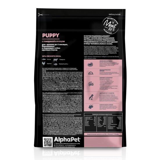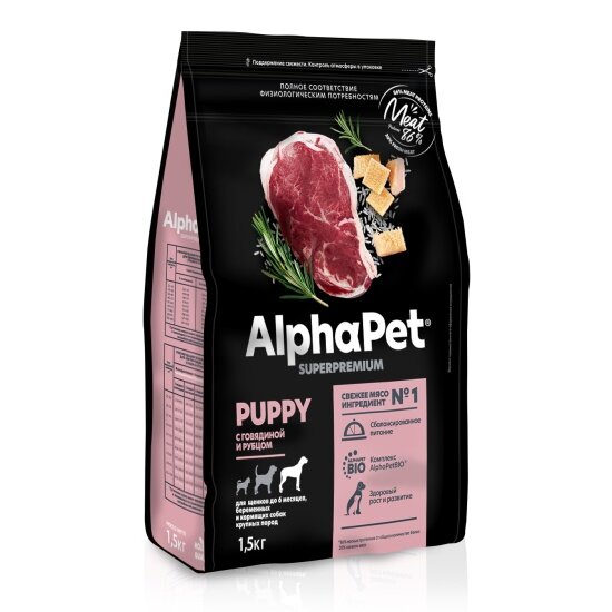 Купить Корм сухой Alphapet Superpremium с говядиной и рубцом для щенков до 6 месяцев, беременных и кормящих собак крупных пород, 1,5 кг с доставкой по всей России.
