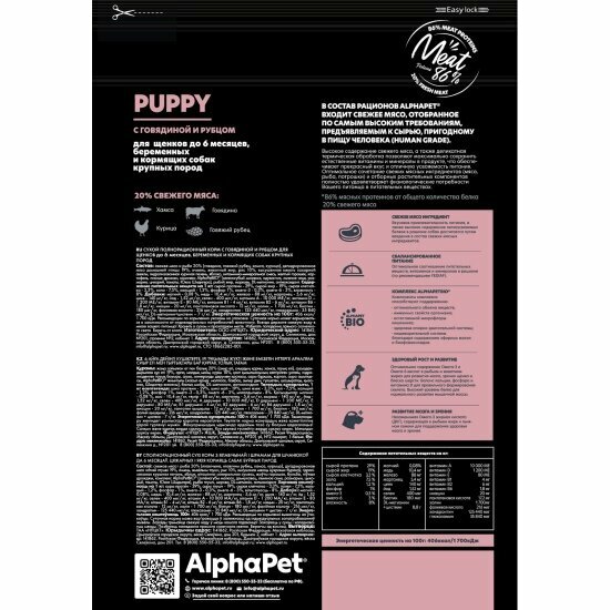 Корм сухой Alphapet Superpremium с говядиной и рубцом для щенков до 6 месяцев, беременных и кормящих собак крупных пород, 1,5 кг: сравнение цен, характеристики, фото, актуальное наличие и цены.
