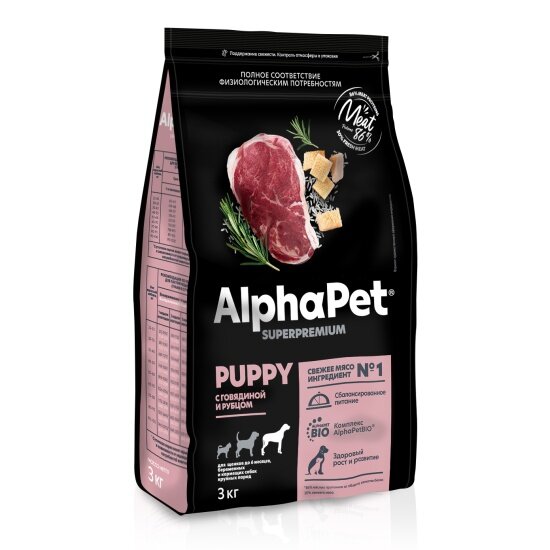 Купить Корм сухой Alphapet Superpremium с говядиной и рубцом для щенков до 6 месяцев, беременных и кормящих собак крупных пород, 3 кг с доставкой по всей России.