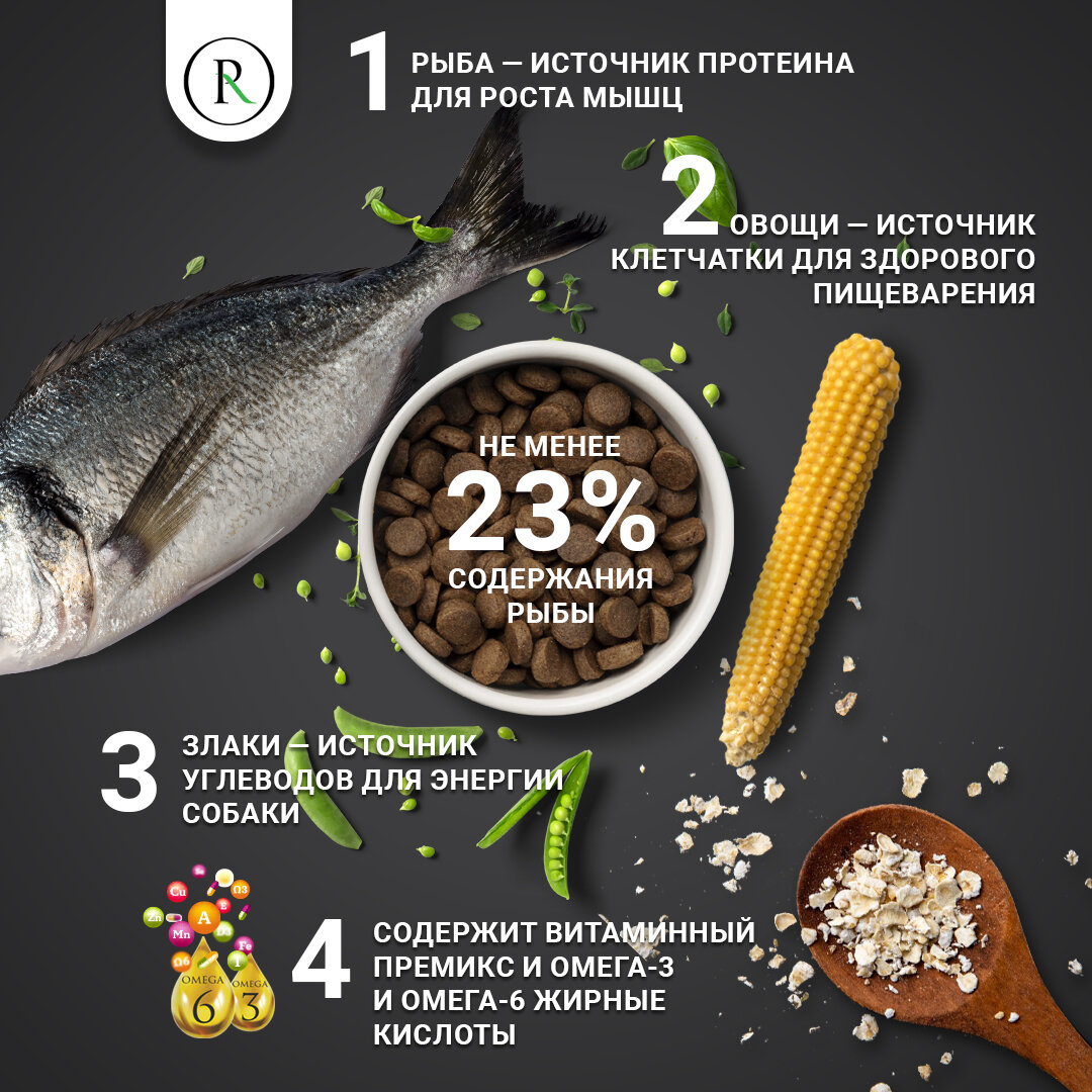 Ингредиенты: Дегидрированная морская белая рыба (не менее 23%), кукуруза, горох, овсяные хлопья, растительный жир, растительные белки, гидролизованные субпродукты, свекловичная клетчатка, комплекс витаминов и минералов, юкка Шидигера
