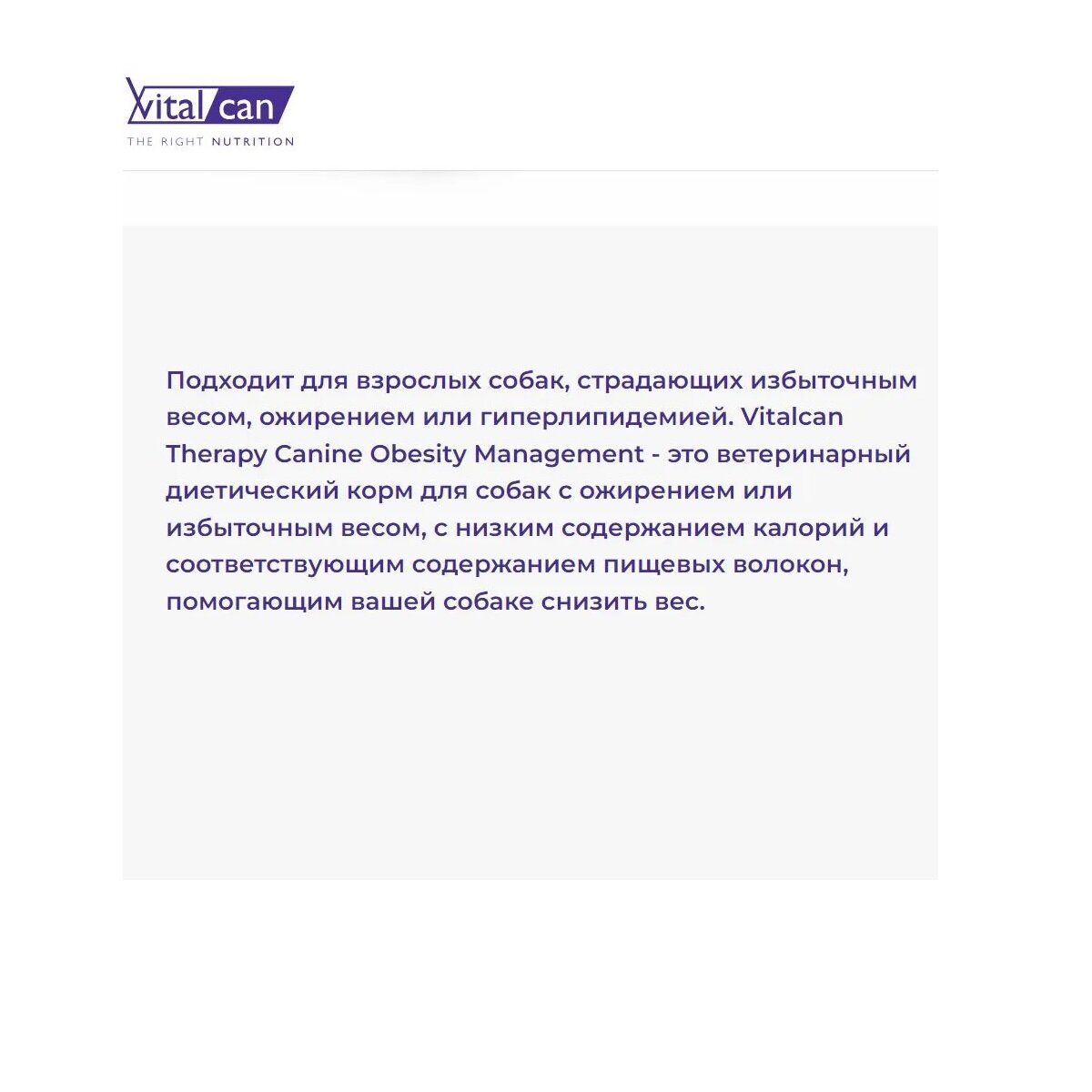 Vitalcan Therapy Canine Obesity Management - полнорационный корм для взрослых собак с избыточным весом или ожирением. Пониженная калорийность с необходимым количеством пищевых волокон способствует снижению веса. • Транспорт жирных кислот: высокая концентрация L-карнитина усиливает транспорт жирных кислот в митохондрии, где они окисляются и превращаются в энергию. • Пониженные калорийность и содержание жира: формула обеспечивает достаточное количество энергии, что способствует здоровому снижению веса и устраняет необходимость в чрезмерном потреблении клетчатки. • Качественный белок: высокое содержание белков высокой биологической ценности способствует здоровому снижению веса, предотвращает потерю мышечной массы.