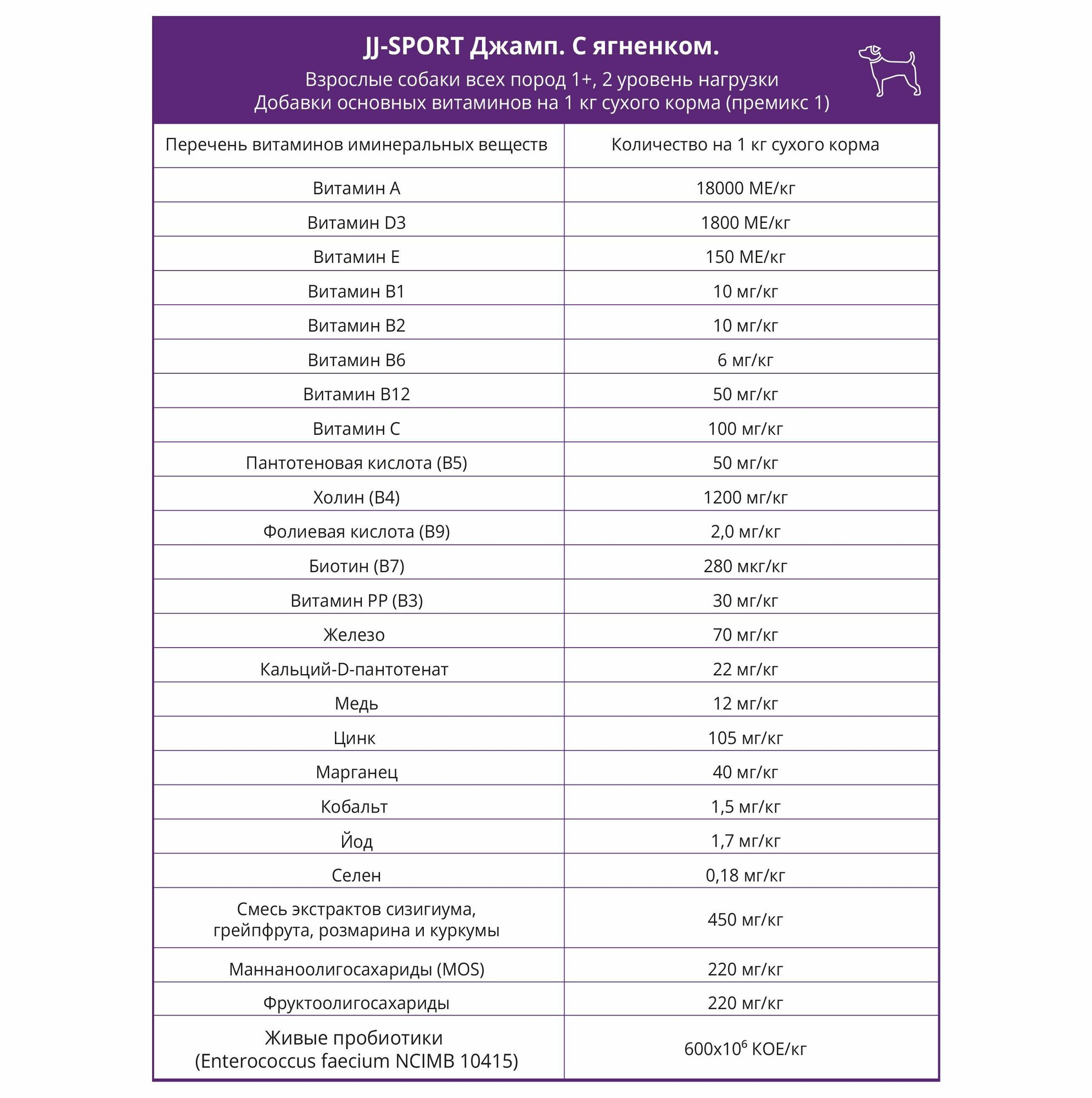 Пищевая ценность: протеин 27%, жир 12%, клетчатка 3,8 %, влажность 9,5 %, минеральные вещества 3,8 %, зола 6,1%, доля жирных кислот омега-3 0,8 %, омега-6 3 %, кальций 1,9 %, фосфор 1,4 %, глюкозамин 1800 мг/кг, хондроитин 1300 мг/кг, L – карнитин 50 мг/кг обменная энергия на 1 кг корма — 3500 Ккал.