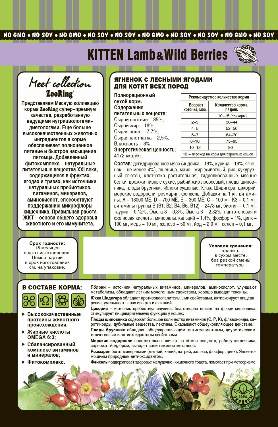 Сухой корм ZooRing Kitten Lamb&Wild Berries, для котят с ягненком и дикими ягодами, 10 кг.: сравнение цен, характеристики, фото, актуальное наличие и цены.