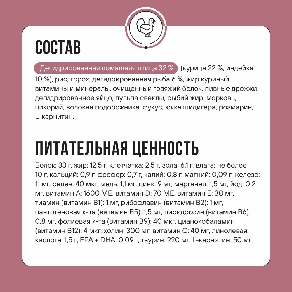Натуральный сухой корм BOWL WOW класса супер - премиум - идеальное питание для стерилизованных кошек! Рацион с индейкой, курицей и свеклой с высоким содержанием белка (78.5%), рассчитанного ветеринарными диетологами, обеспечивает легкое пищеварение питомцев, живущих в домашних условиях. Организм насыщается аминокислотами без лишней нагрузки на почки. Полнорационный продукт для кормления кошечки после стерилизации имеет пониженный уровень жиров и содержание кальция, фосфора и магния для профилактики мочекаменной болезни, и повышенный - клетчатки специально для контроля веса животного. Корм содержит только полезные ингредиенты, чтобы обеспечить сбалансированный рацион для правильного функционирования организма. Кошачий корм эффективен в профилактике диабета за счет контроля уровня сахара в крови, а натуральный источник йода – фукус – поможет в поддержке иммунной системы. Он имеет в составе, куриный жир, комплекс витаминов и минералов, в том числе L-карнитин для правильного метаболизма жиров. Клетчатка, содержащаяся в составе, оказывает мягкое действие, помогая функционированию ЖКТ, и способствует выводу шерсти. Зоотовар с овощами – горохом, свеклой, морковью, и курочкой с индейкой незаменим для профилактики мочекаменной болезни. Продукт не содержит синтетических ароматизаторов, усилителей вкуса и ГМО. Поставляется в упаковке весом 400 грамм. Он также подходит для животных с чувствительным пищеварением, для котов и молодых котиков, мелких, средних и крупных пород. Произведен в соответстви нормами по кормам FEDIAF, NRC и российскому госту Р 55453-2022. Позаботьтесь о своем четвероногом друге. Корм нашего бренда - основа здоровья питомца!