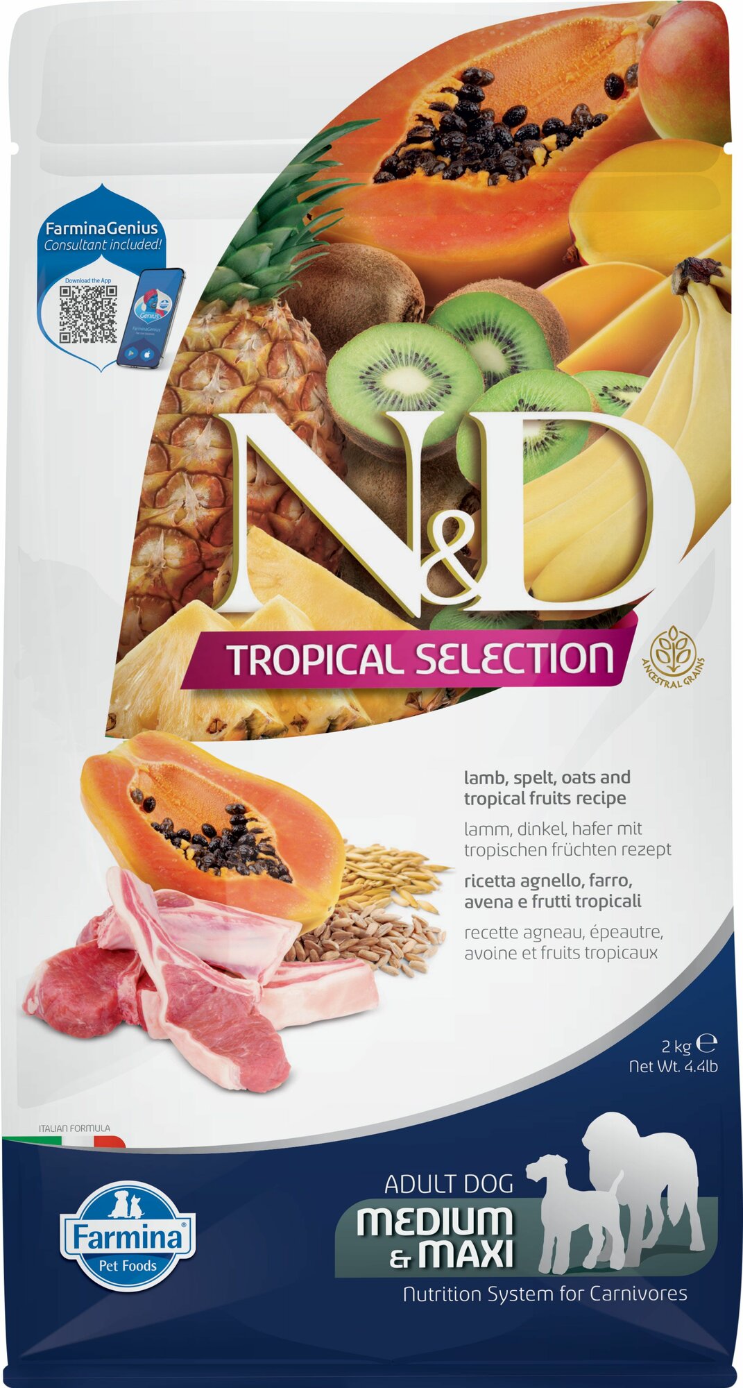 Сухой низкозерновой корм Farmina N&D Tropical Selection Dog Medium&Maxi для взрослых собак средних и крупных пород, ягнёнок, 2 кг: сравнение цен, характеристики, фото, актуальное наличие и цены.